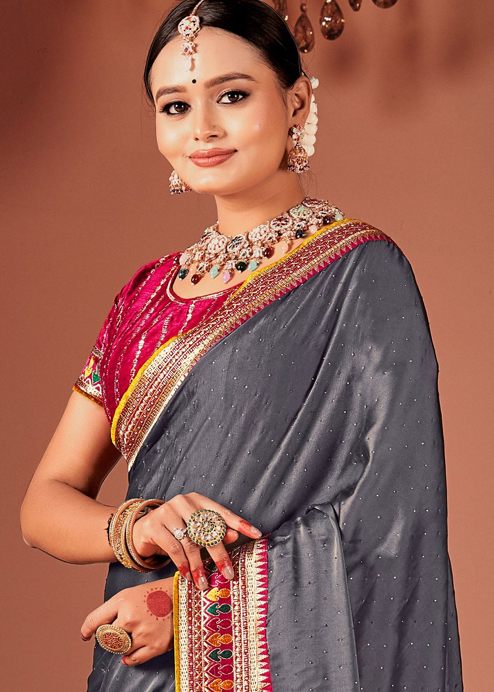 Look pretty wearing this grey colored art silk saree crafted with zari, thread embroidered border, stone work. Paired with a maroon colored art silk blouse. The unstitched blouse can be customized upto 42 inches. Do note: All the accessories shown are for styling purposes only. Slight color variation may occur due to photographic reasons.
