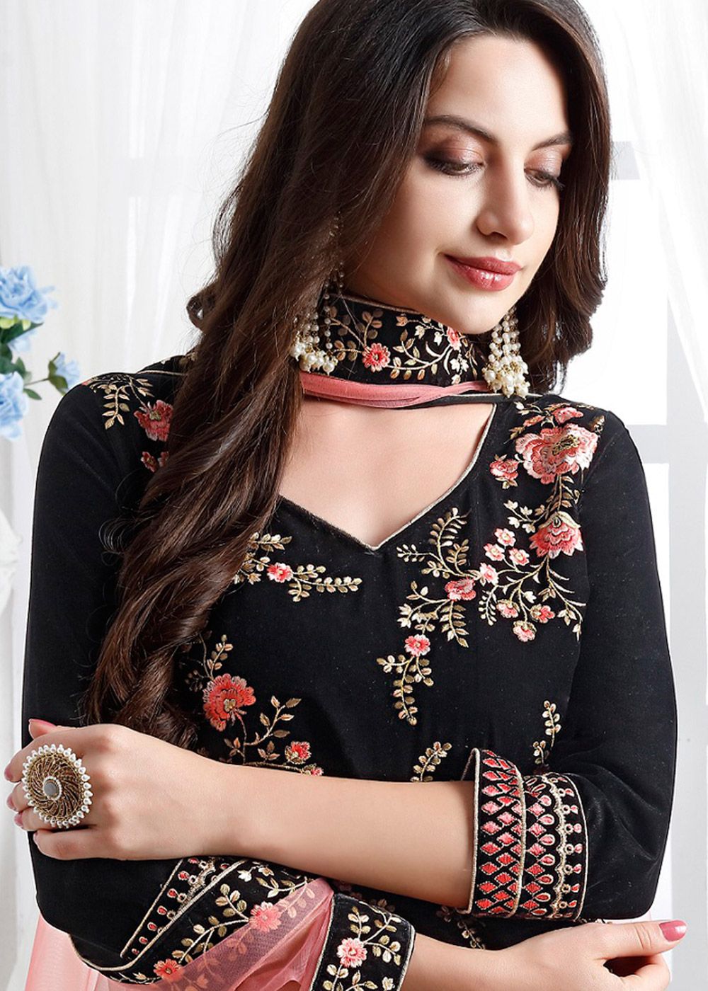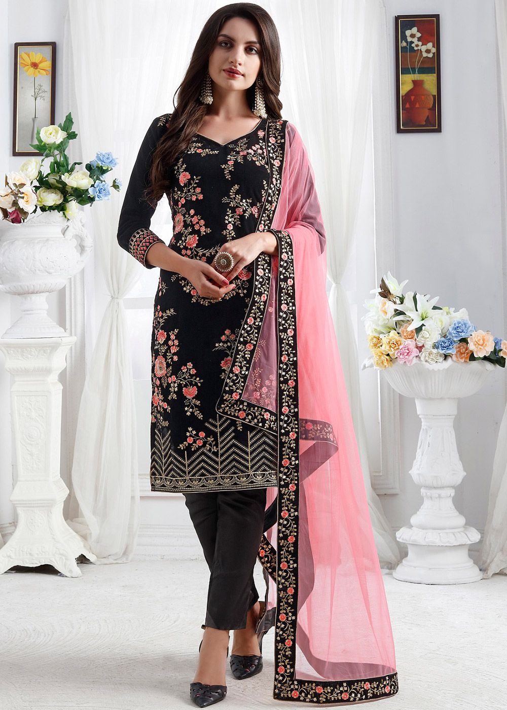 Look gorgeous adorning this black colored velvet kameez crafted with thread, zari embroidery all over. Paired with a matching colored santoon pant and a peach colored net dupatta. The semi stitched kameez can be customized up to 42 inches. Do Note: All the accessories shown are for styling purposes only. Slight color variation may occur due to photographic reasons.