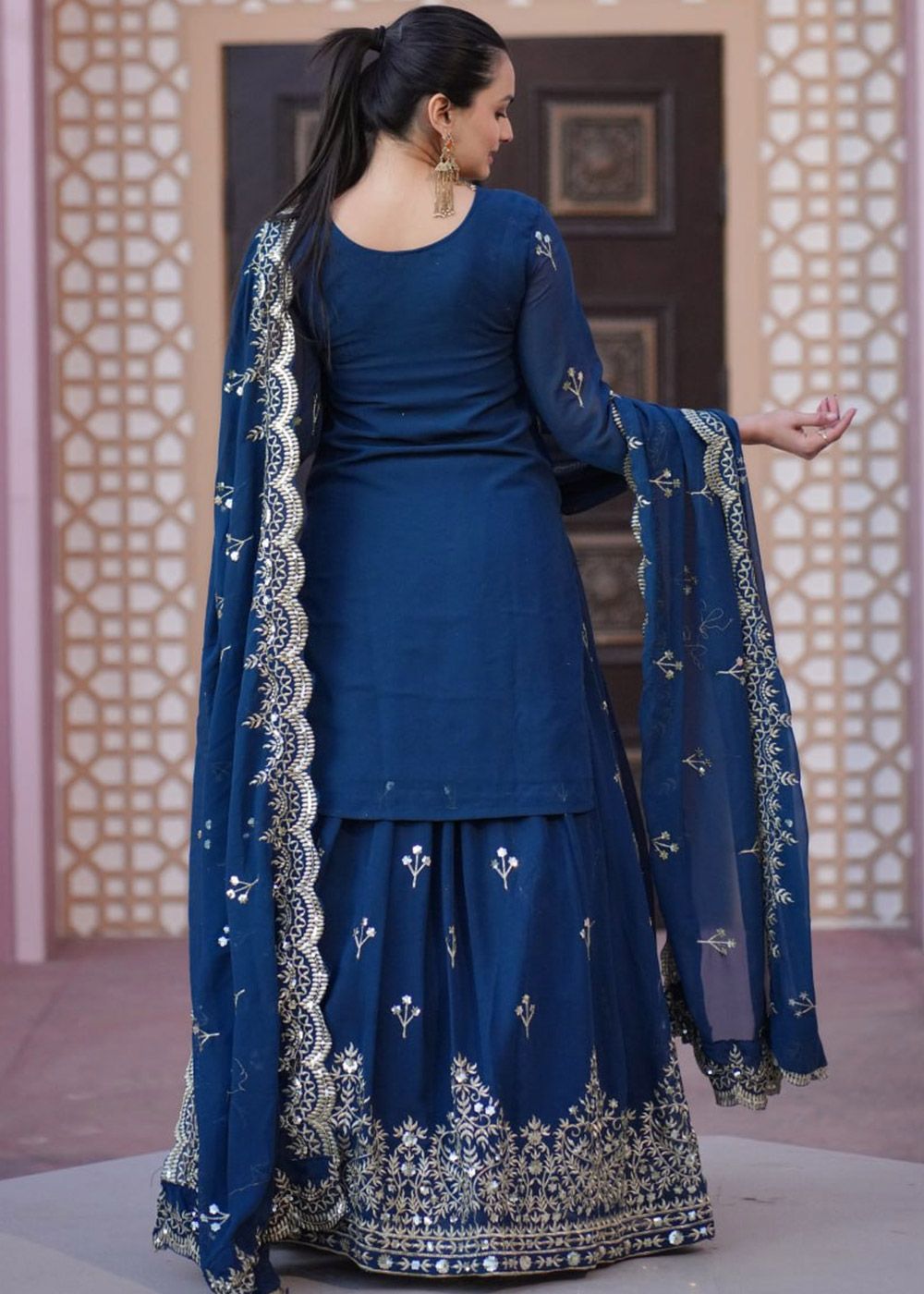 Grace the ambiance adorning this readymade blue colored georgette kurti crafted with dori, sequins embroidery all over. Paired with a matching colored georgette lehenga and a georgette dupatta, both embllished in similar work embroidery. The given length of both kurti & bottom is 36-37 and 40 inches. Do note: All the accessories shown are for styling purposes only. Slight color variation may occur due to photograhphic reasons.