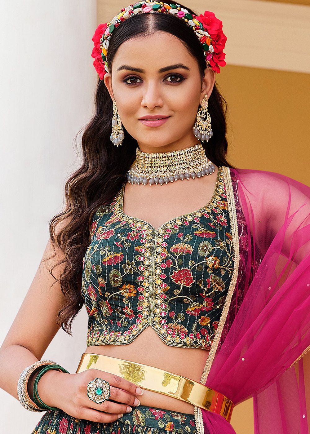 Steal the scene to adorn this readymade blue-coloured chiffon lehenga crafted with thread and sequins enhanced with print all over. Paired with a blue-coloured chiffon choli and a pink color georgette dupatta. Do Note: All the accessories shown are for styling purposes only. Slight color variation may occur due to photographic reasons.