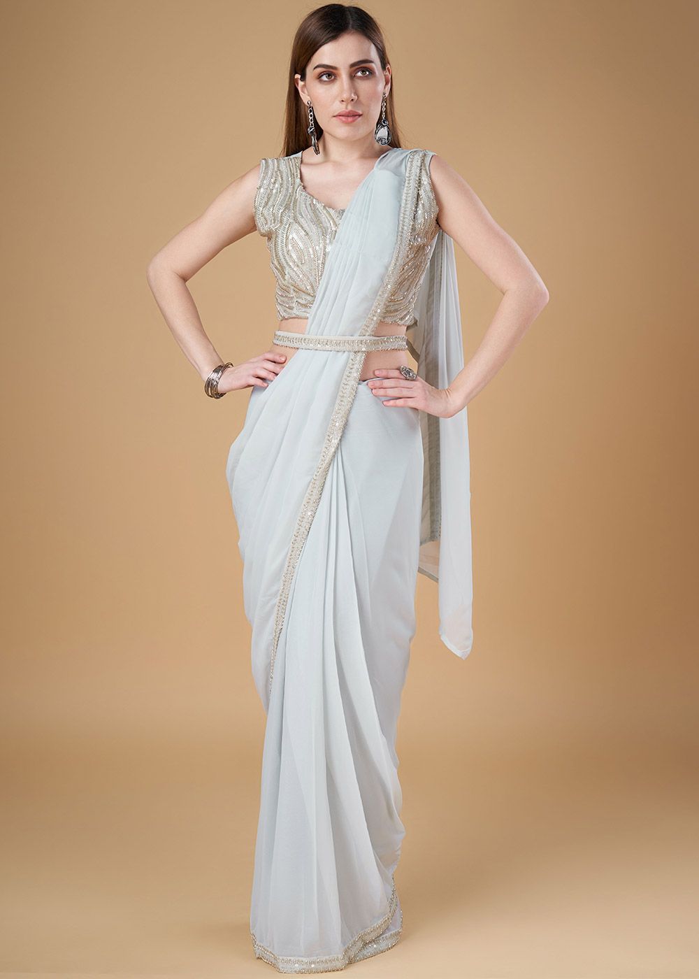 Drape yourself in this readymade blue-colored georgette plain saree. Paired along with a matching colored georgette blouse in thread, sequins and cutwork. Do Note: All the accessories shown are for styling purposes only. Slight color variation may occur due to photographic reasons.
