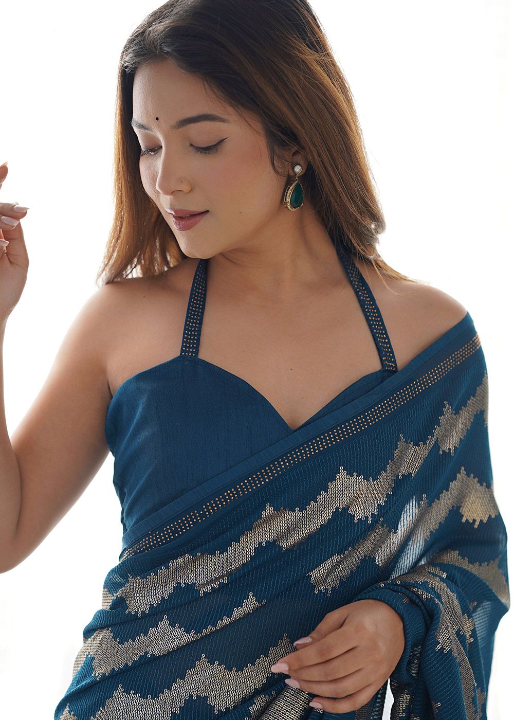 Blue Embroidered Party Wear Pre-Stitched SareeSpecial Price US$60.80 Regular Price US$76.00