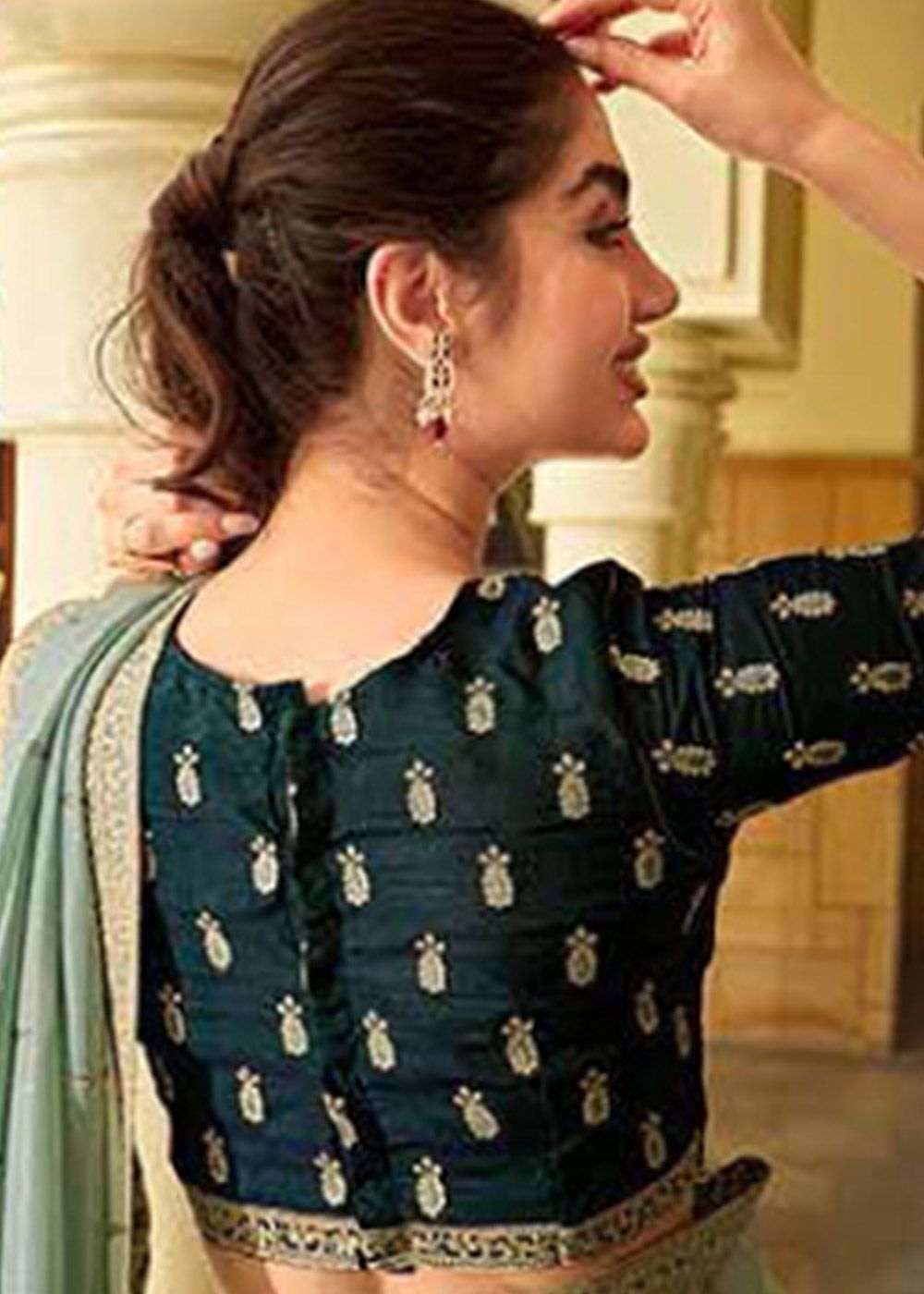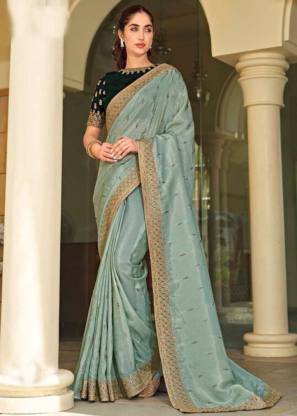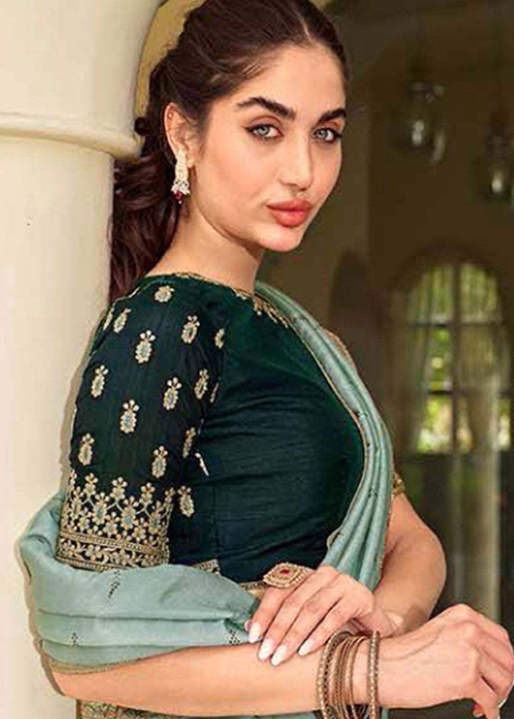 Grace the whole ambience by adorning this blue-coloured silk saree enhanced by the embroidered border. Paired with a matching coloured embroidered silk blouse. The unstitched blouse can be customized upto 42 inches. Do Note: All the accessories shown are for styling purposes only. Slight color variation may occur due to photographic reasons.