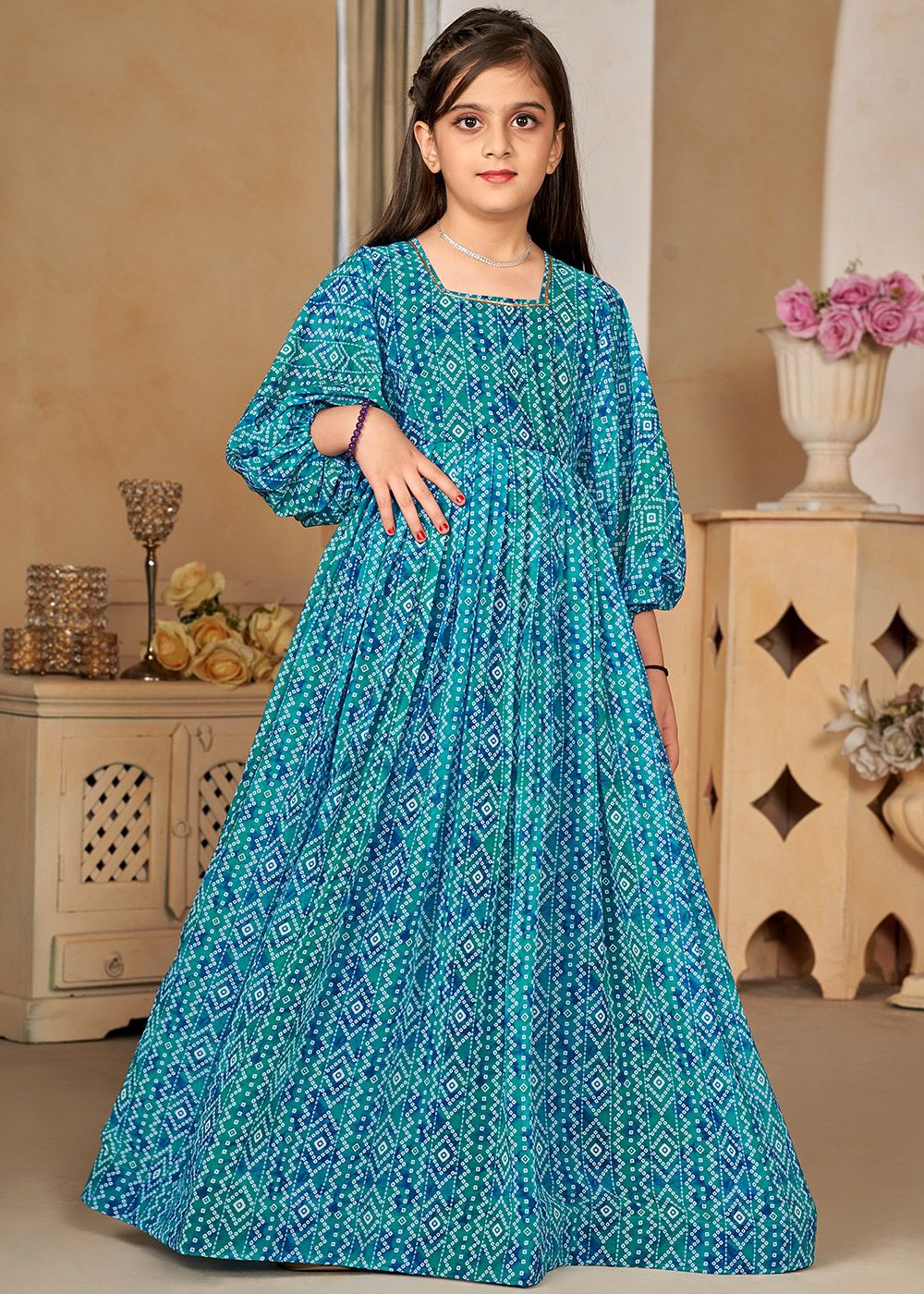 Look beautiful adorning this readymade blue colored georgette kids gown crafted with printed work all over. Enhanced by bell sleeves and square neck. Do Note: All Accessories shown are for styling purpose only. Slight color variation may occur due to photographic reasons. Measurement variation up to 1 inch is possible.