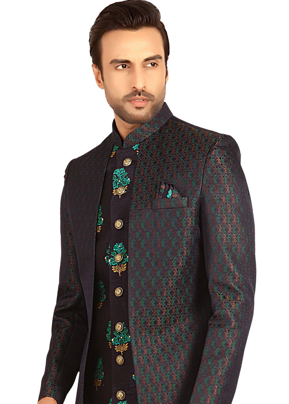 Navy Blue Woven Indo Western Sherwani SetSpecial Price US$114.00 Regular Price US$152.00 -
