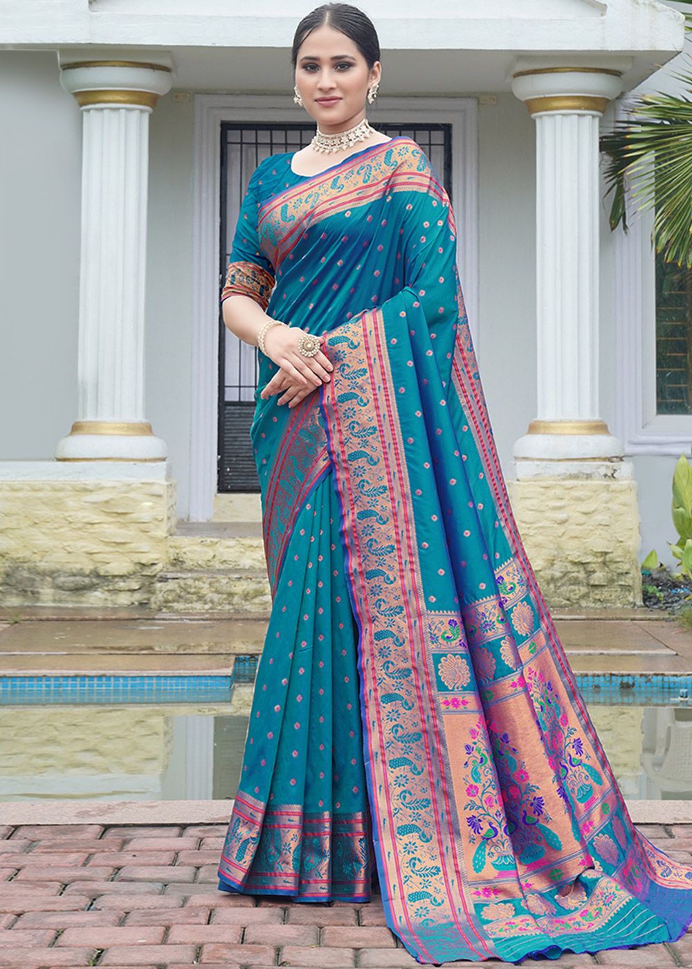 Teal Blue Zari Woven Saree In Art SilkSpecial Price US$59.20 Regular Price US$74.00 -