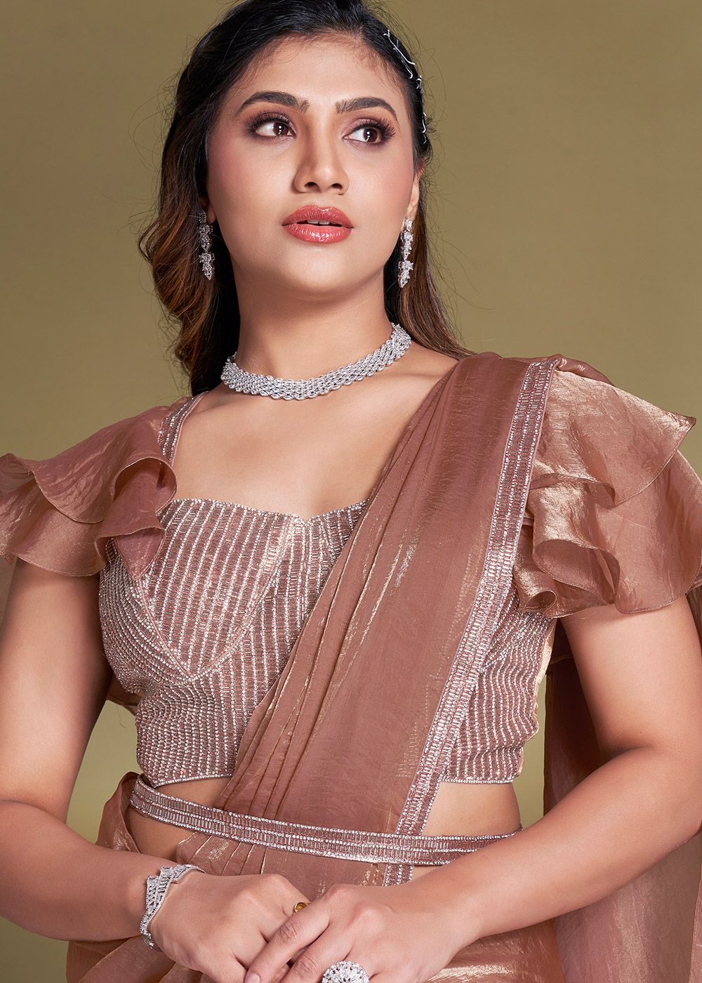 Look beautiful adorning this pre-stitched brown colored satin silk saree crafted with sequins, cutbeads embroidery. Paired with a matching colored embellished ruffle sleeves blouse and embroidered belt. Do Note: All the accessories shown are for styling purposes only. Slight color variation may occur due to photographic reasons.