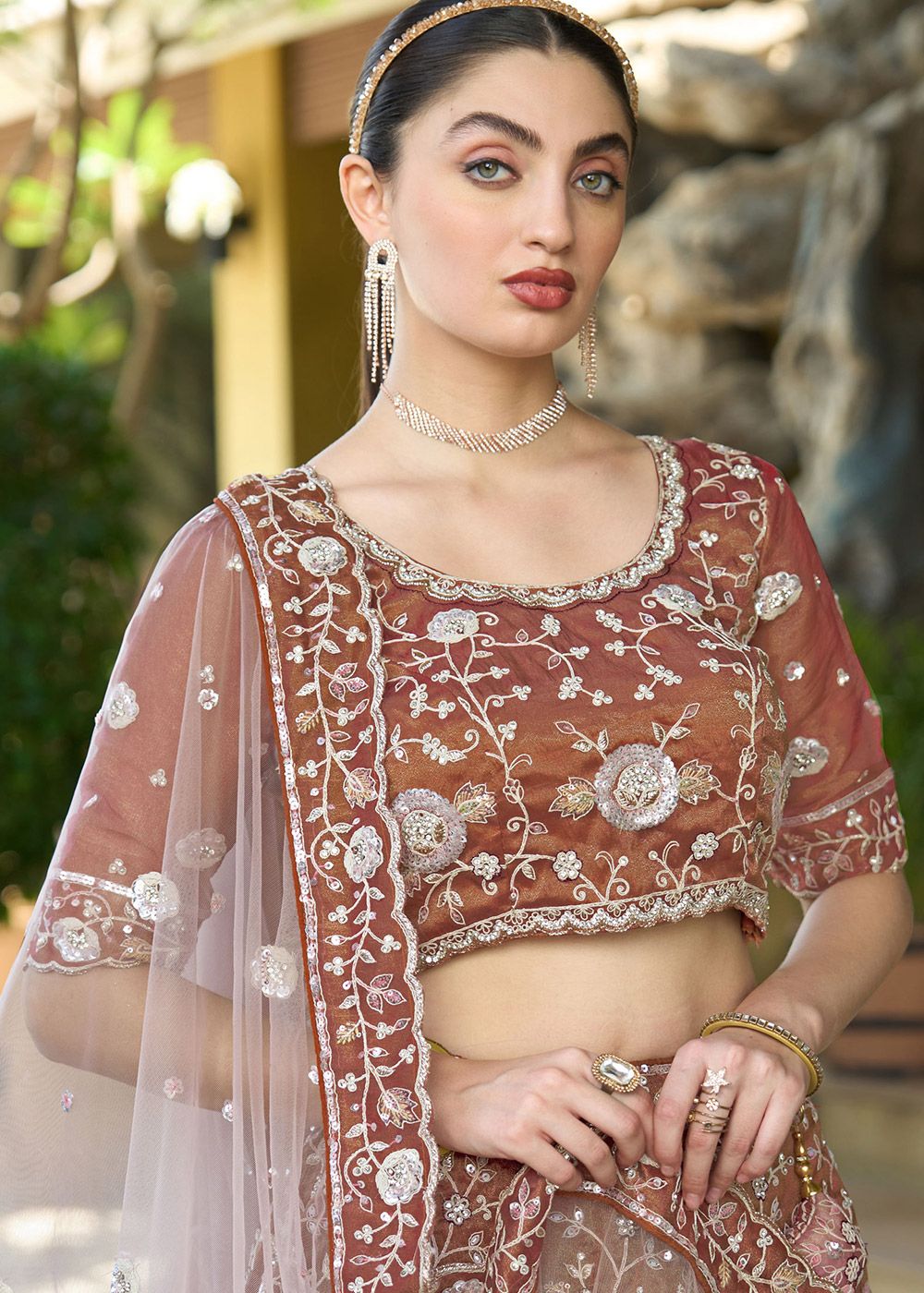 Light Brown Embroidered Lehenga Choli In NetSpecial Price US$148.80 Regular Price US$186.00 -