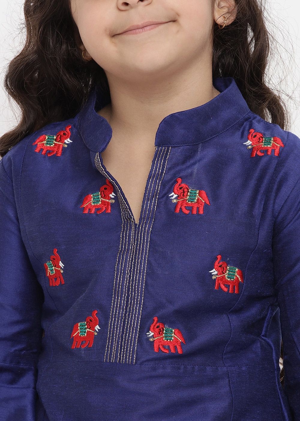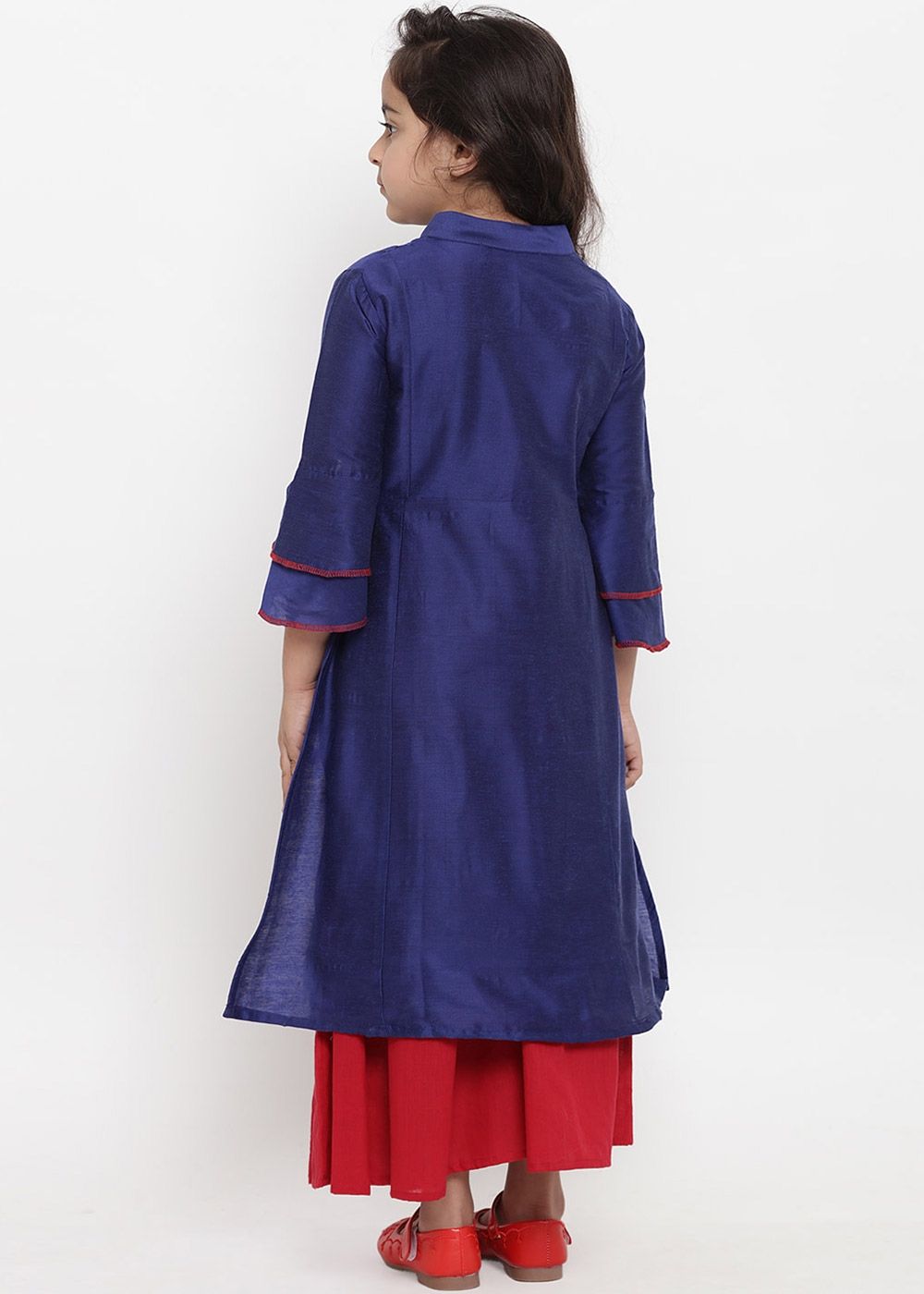 Readymade blue color bell style sleeved dupion silk kids kurta has been beautified with thread work embroidered motifs around its yoke. Complemented by a red color cotton palazzo. Do Note: All Accessories shown are for styling purpose only. Buttons are a part of adornment and it can vary in design. Slight color variation may occur due to photographic reasons.