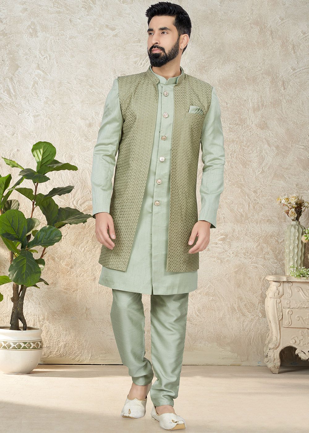Showcasing in this readymade sage green colored jacket style indo western sherwani in art silk. Topped up by a sage green colored thread embroidered jacket in an art silk enhanced with a mandarin collar, pocket square and full sleeves. Accompanied by sage green colored an art silk pant. Measurement variation up to 1 inch is possible. Do Note: All Accessories shown are for styling purpose only. Buttons are a part of adornment and it can vary in design. Slight color variation may occur due to photographic reasons.