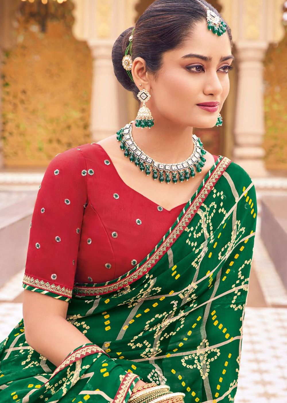 Look pretty with this green-colored georgette saree crafted with bandhej print enchance with embroidered and paired with a red-colored brocade blouse. The unstitched blouse can be customized up to 42 inches. Do Note:All the accessories shown are for styling purposes only. Slight color variation may occur due to photographic reasons