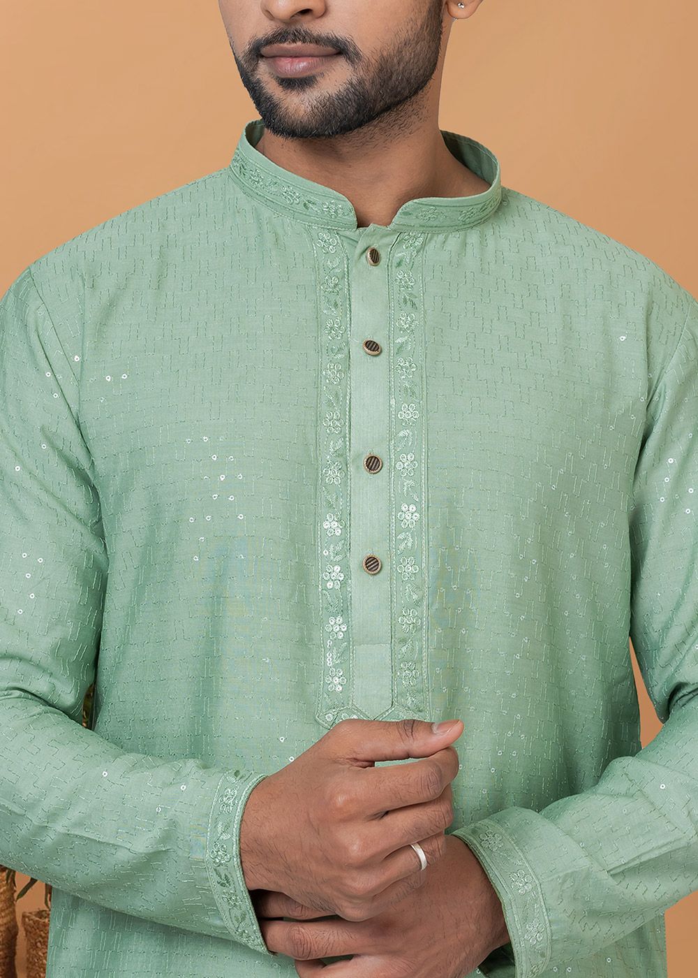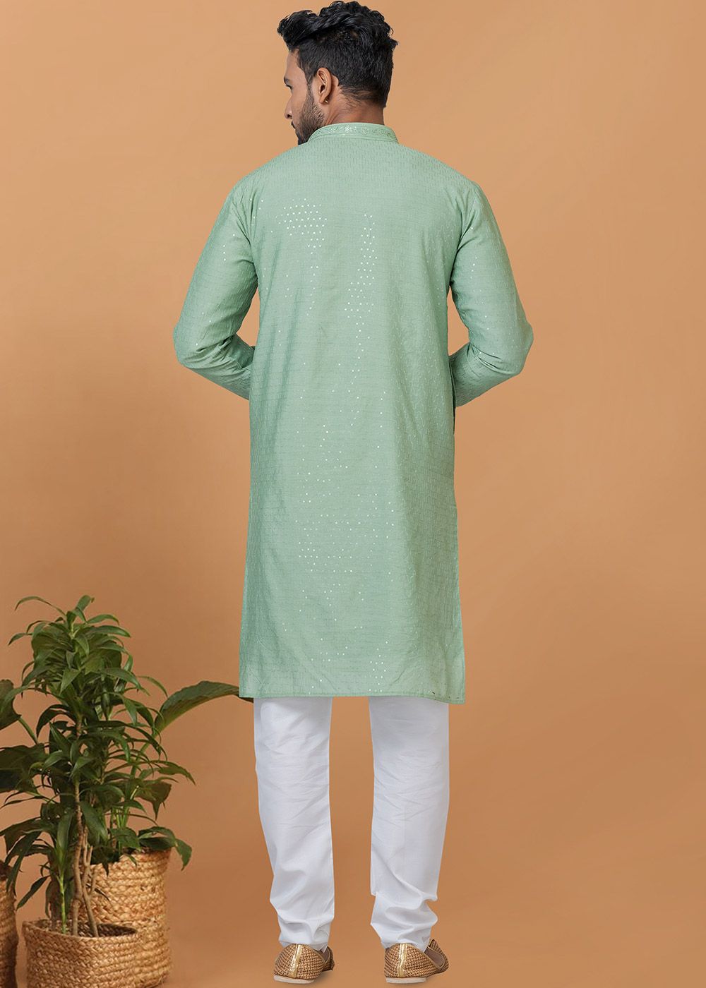 Green Sequins Embroidered Kurta Pajama In Cotton