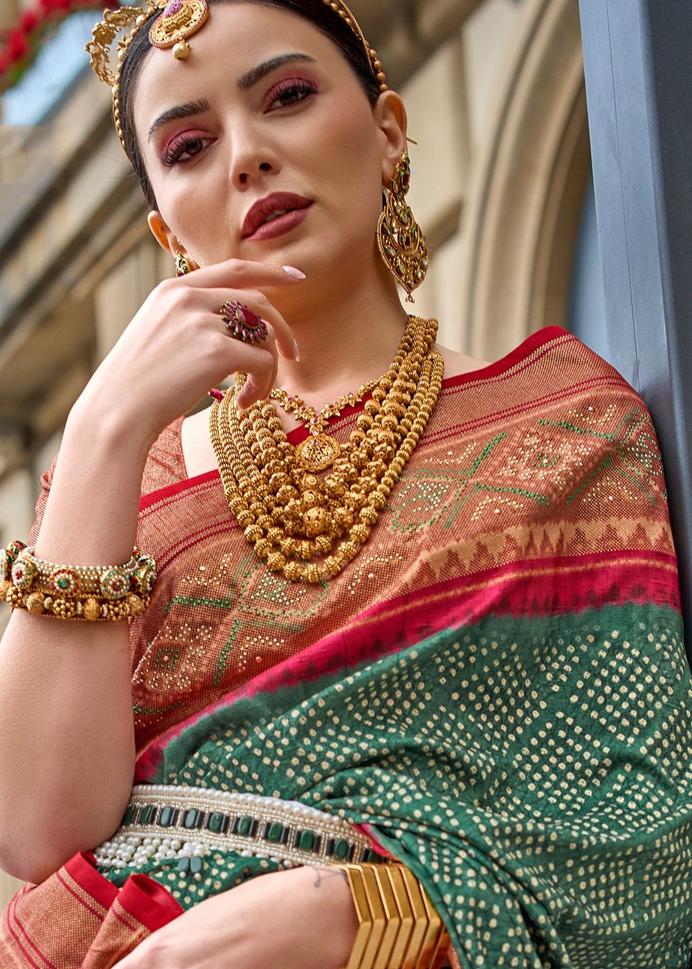 Spread your magic by wrapping around this green colour silk saree. It is enhanced with zari, woven work . Paired with a red colour silk blouse with woven sleeves. The unstitched blouse can be customized up to 42 inches. Do Note: All accessories shown are for styling purpose only. Slight color variation may occur due to photographic reasons.