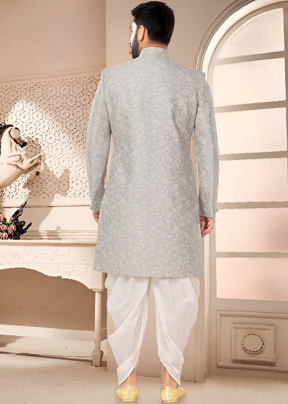 Grey Readymade Indowestern Dhoti & Sherwani In Embroidery