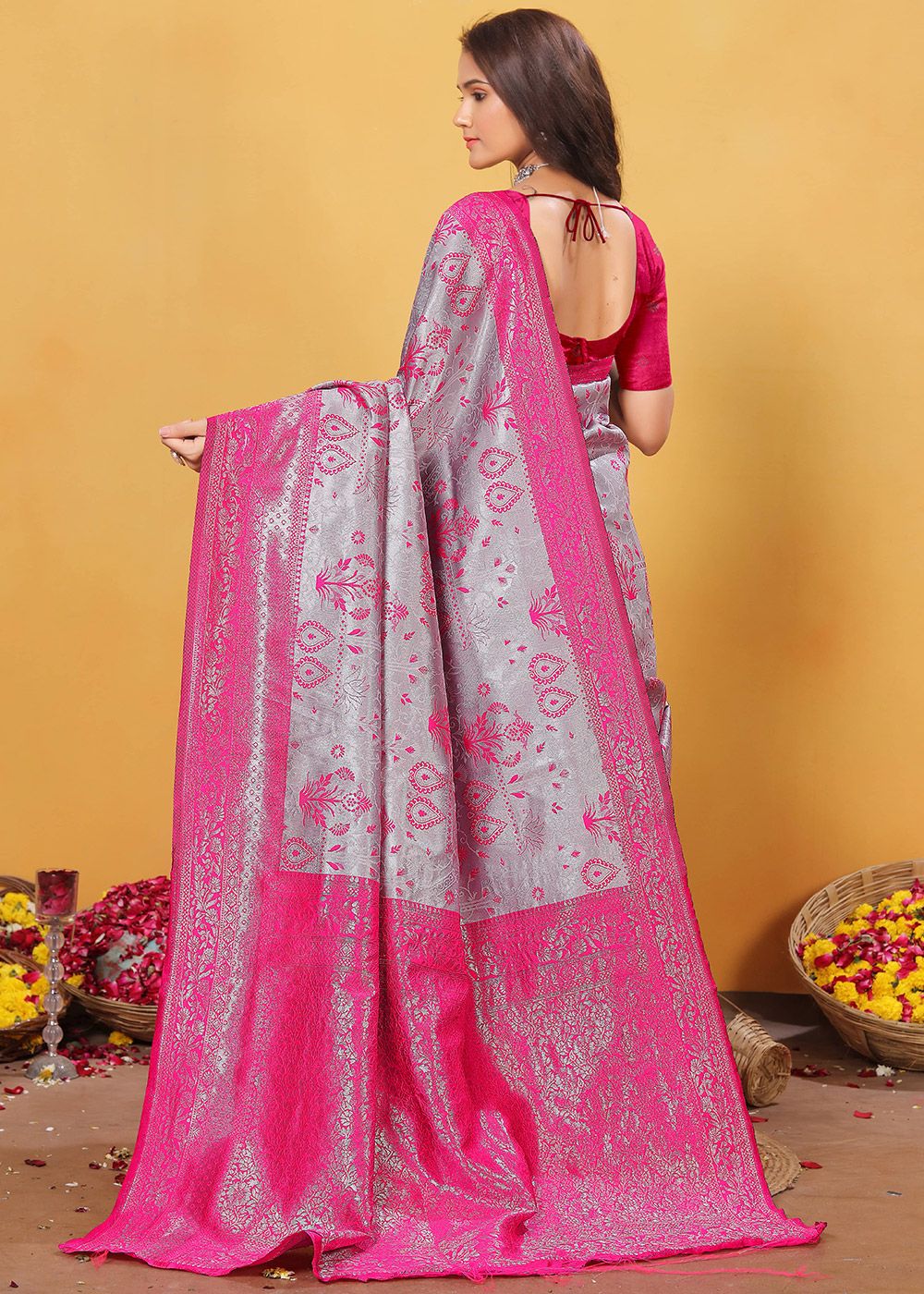 Display your beauty adorning this grey colored art silk saree crafted with zari woven work all over enhanced by distinctive border. Paired with a pink colored art silk blouse. The unstitched blouse can be customized upto 42 inches. Do note: All the accessories shown are for styling purposes only. Slight color variation may occur due to photographic reasons.