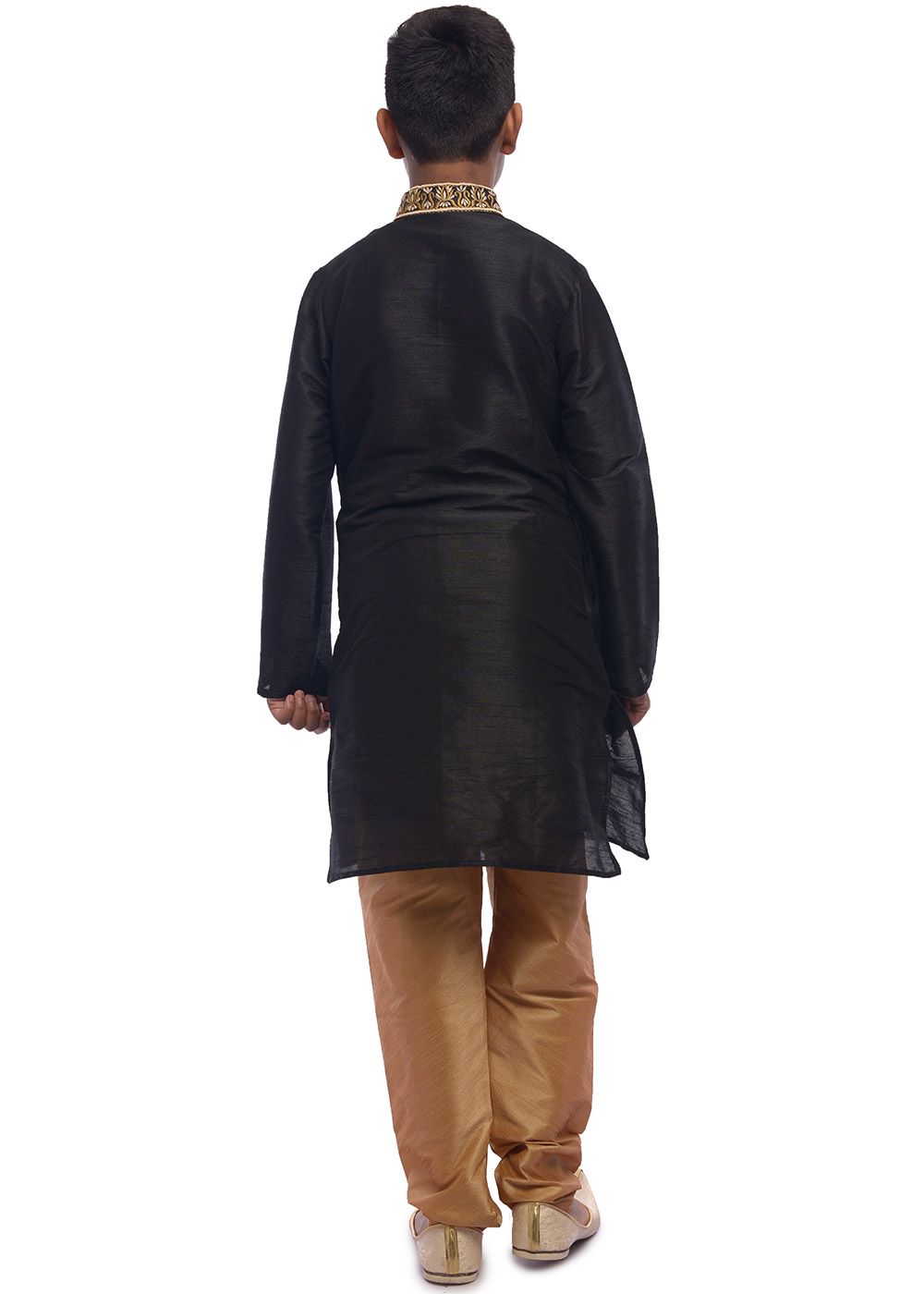 Showcasing this readymade black colored kids dupion silk kurta crafted with thread embroidery. Available with a brown colored dupion silk churidar. Do Note: All Accessories shown are for styling purpose only. Slight color variation may occur due to photographic reasons. Measurement variation up to 1 inch is possible.