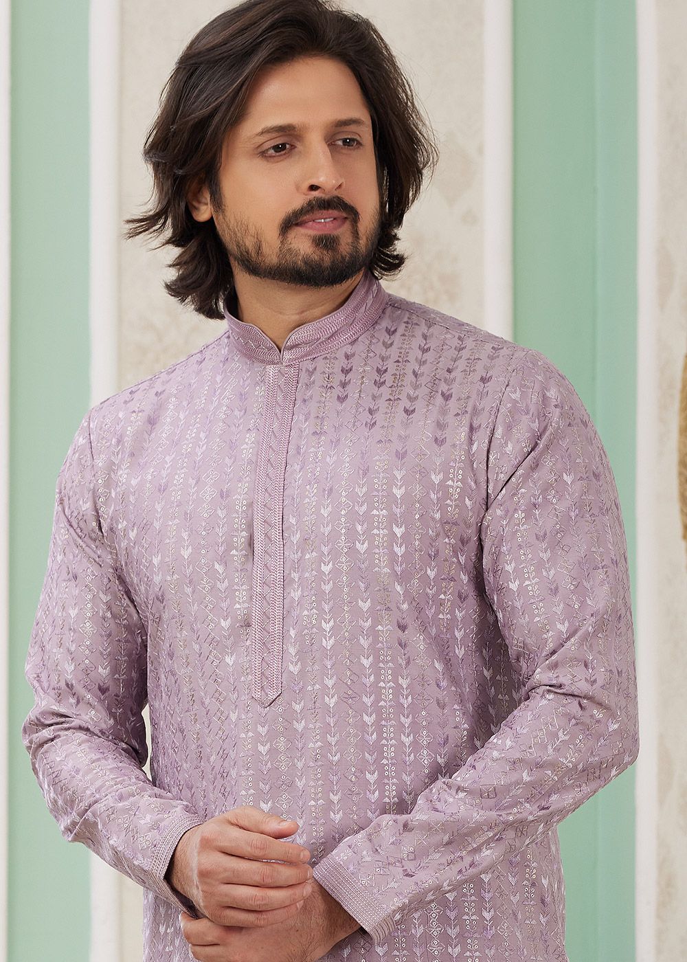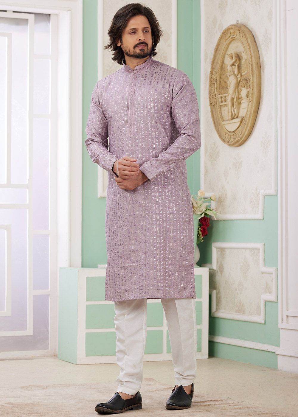 Lavender Readymade Men Embroidered Kurta Pajama Set