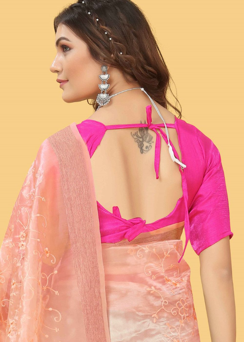 Look pretty adorning this light orange colored organza crafted with thread, zari embroidery. Paired with pink colored art silk blouse. The unstitched blouse can be customized upto 42 inches. Do Note: All the accessories shown are for styling purposes only. Slight color variation may occur due to photographic reasons.