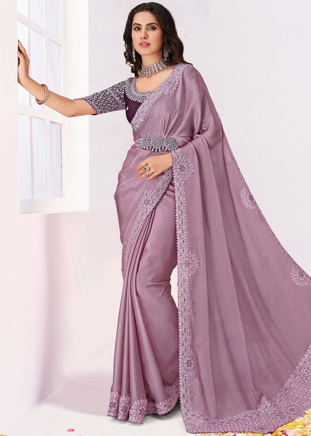 Capture hearts adorning this mauve purple colored silk saree crafted with dori, sequins embroidery and belt. Paired with a purple colored embroidered silk blouse. The unstitched blouse can be customized upto 42 inches. Do Note: All the accessoris shown are for styling purposes only. Slight color variation may occur due to photographic reasons.
