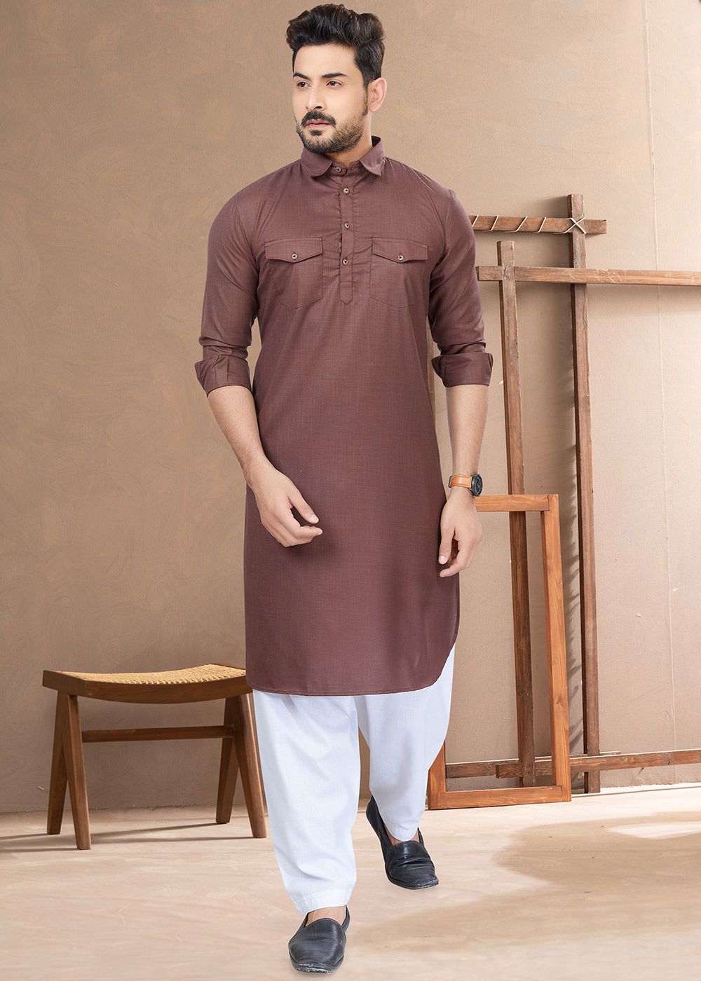 Mens Brown Cotton Pathani Suit