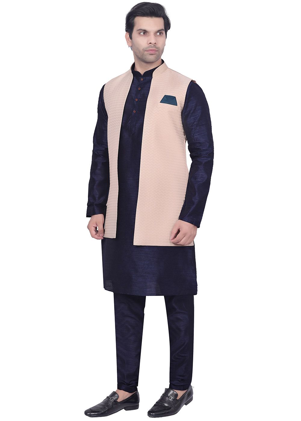 Navy Blue Kurta Pajama With Woven Long Jacket