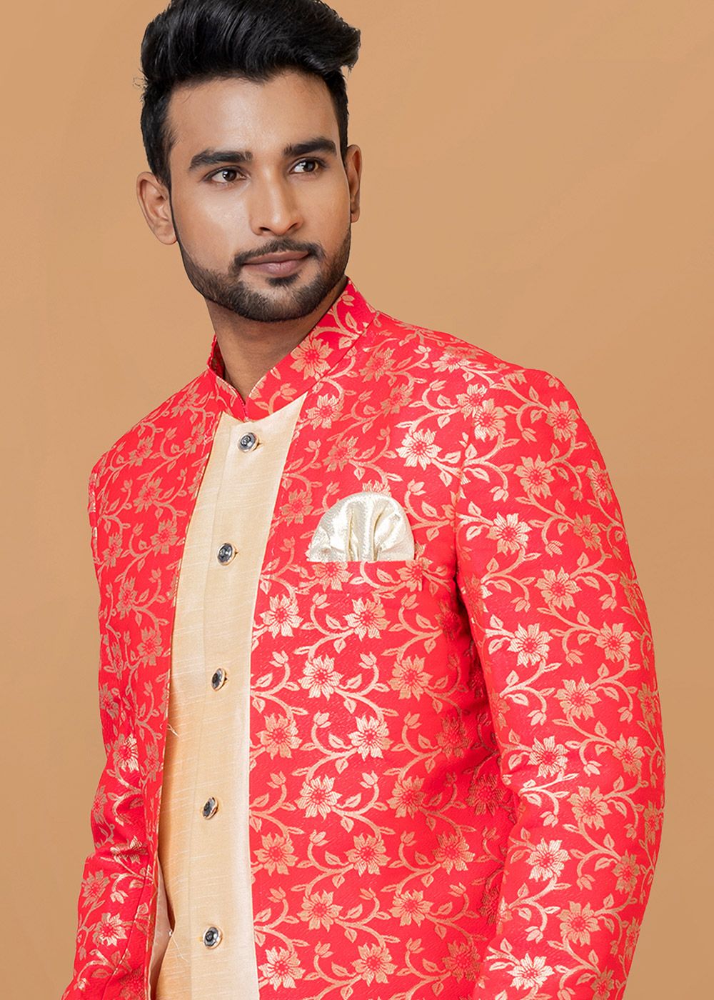 Orange Woven Indo Western Sherwani For MenSpecial Price US$114.00 Regular Price US$152.00 -
