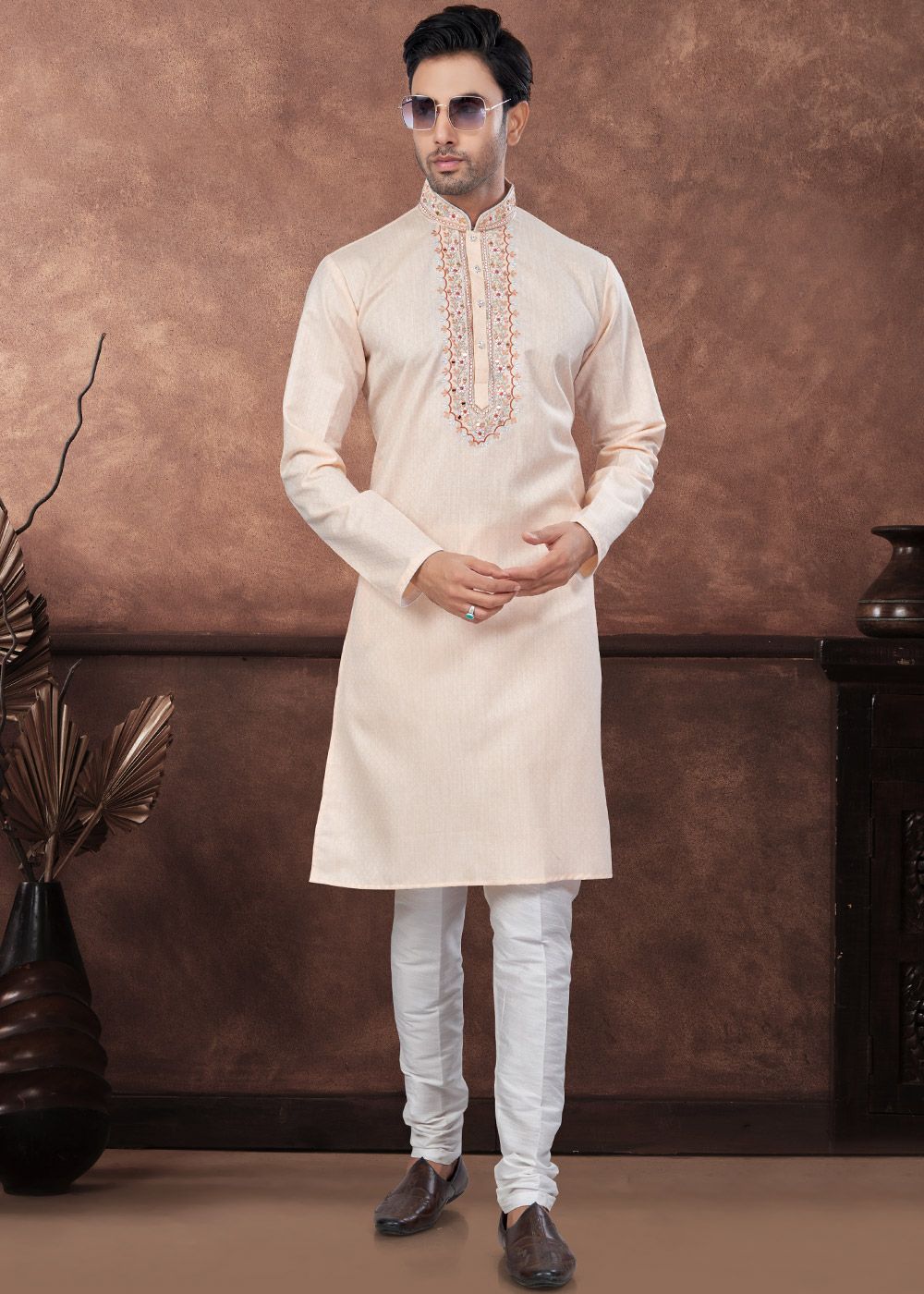 Peach Readymade Men Cotton Kurta Pajama In Embroidery