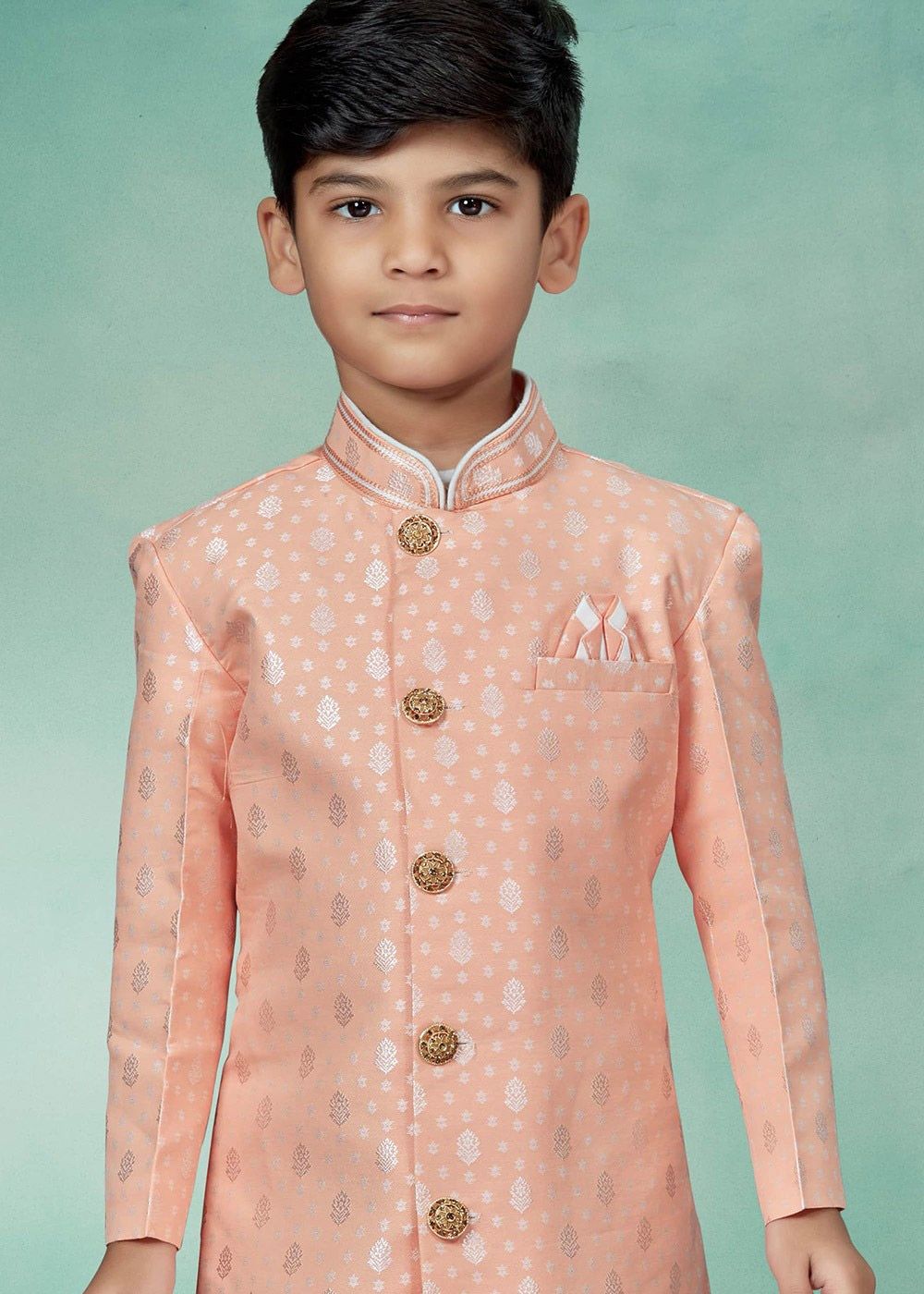 Peach color full sleeved art silk jacquard kids sherwani that has been designed with woven detailed motifs enhanced by fancy buttons and pocket square. The readymade sherwani has been matched with a white color dupion silk pajama. Do Note: All Accessories shown are for styling purpose only. Buttons are a part of adornment and it can vary in design. Slight color variation may occur due to photographic reasons.