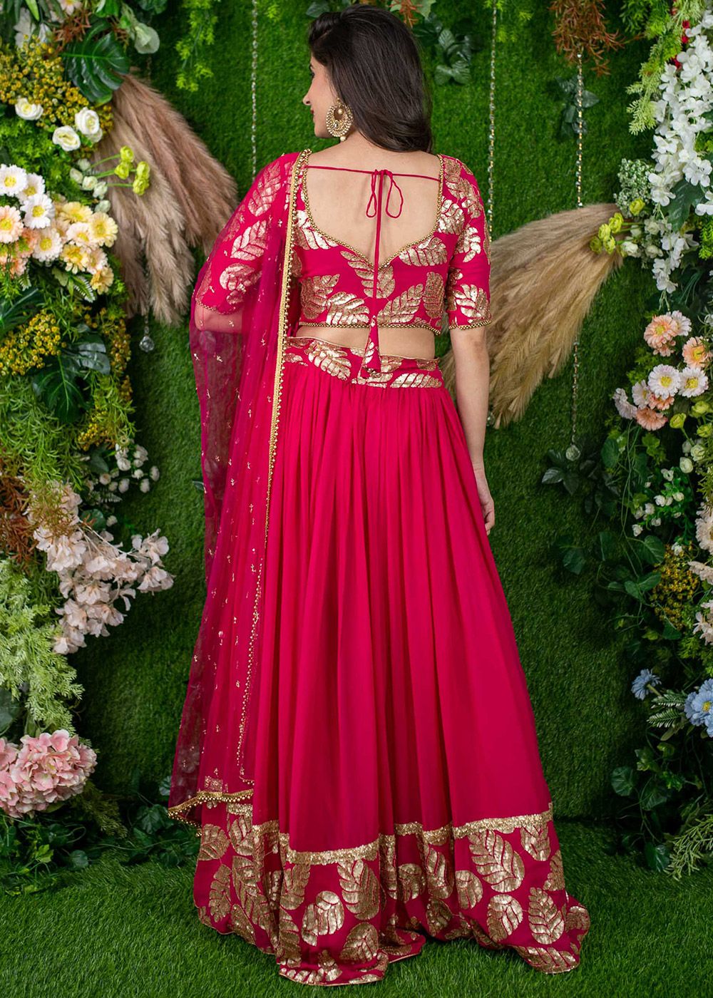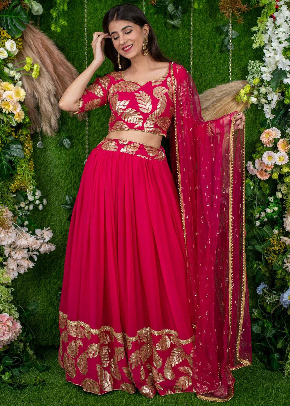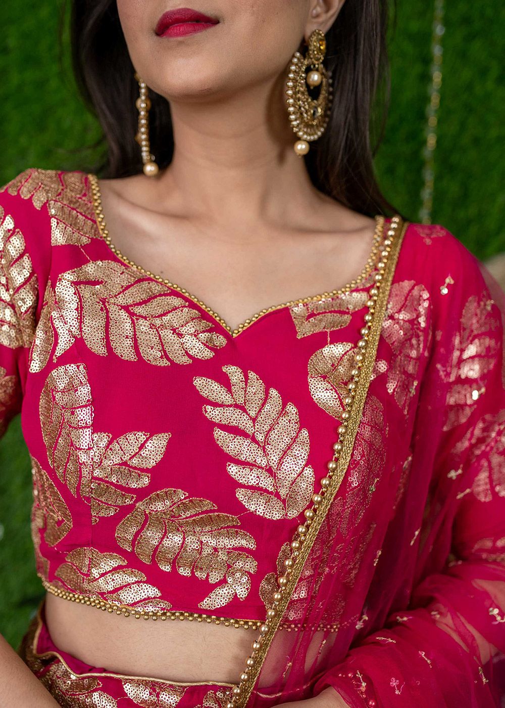 Walk in style adorning this pink-colored georgette lehenga crafted with thread sequin embroidery. Paired with matching colored georgette choli and a net dupatta, all embellished in similar embroidery. The semi-stitched choli can be customized up to 42 inches. Do note: All the accessories shown are for styling purposes only. Slight color variation may occur due to photographic reasons.