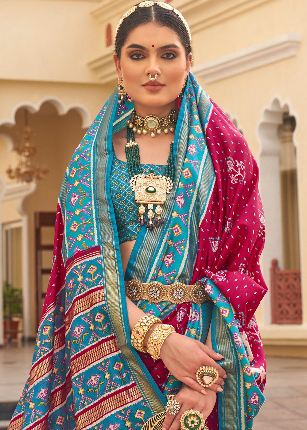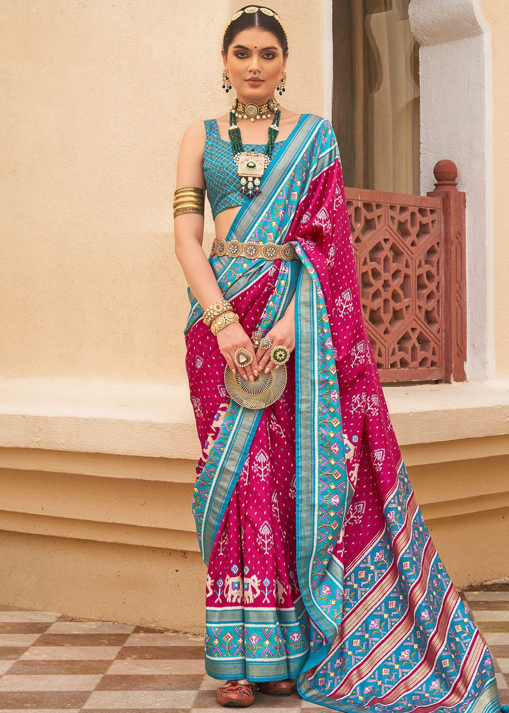 Style yourself by adorning this pink colored art silk saree crafted with all over patola print patterns enhanced by zari woven distinctive border and tasseled pallu detail. Accompanied along with a blue colored similarly printed art silk blouse. The unstitched blouse can be customized upto 42 inches. Do Note: All the accessories shown are for styling purpose only. Slight color variation may occur due to photographic reasons.
