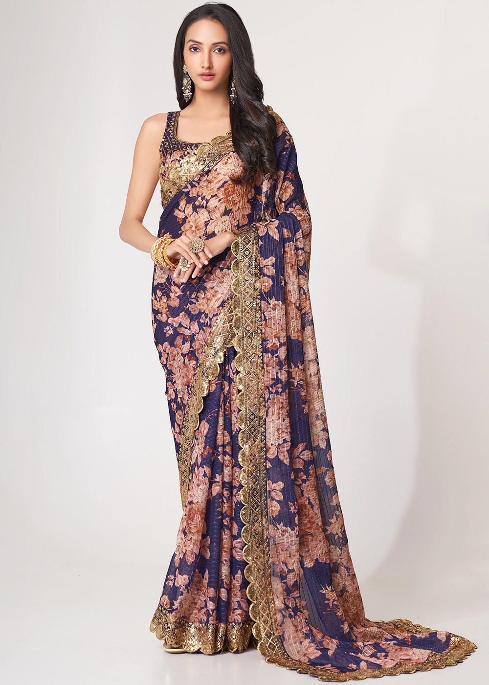 Add a touch of effortless glamour to your wardrobe with this purple colored organza saree crafted with digital floral print all over enhanced by sequins, thread embroidered scalloped border. Paired with a purple colored similarly embroidered organza blouse. The unstitched blouse can be customized upto 44 inches. Do Note: All the accessories shown are for styling purposes only. Slight color variation may occur due to photographic reasons.