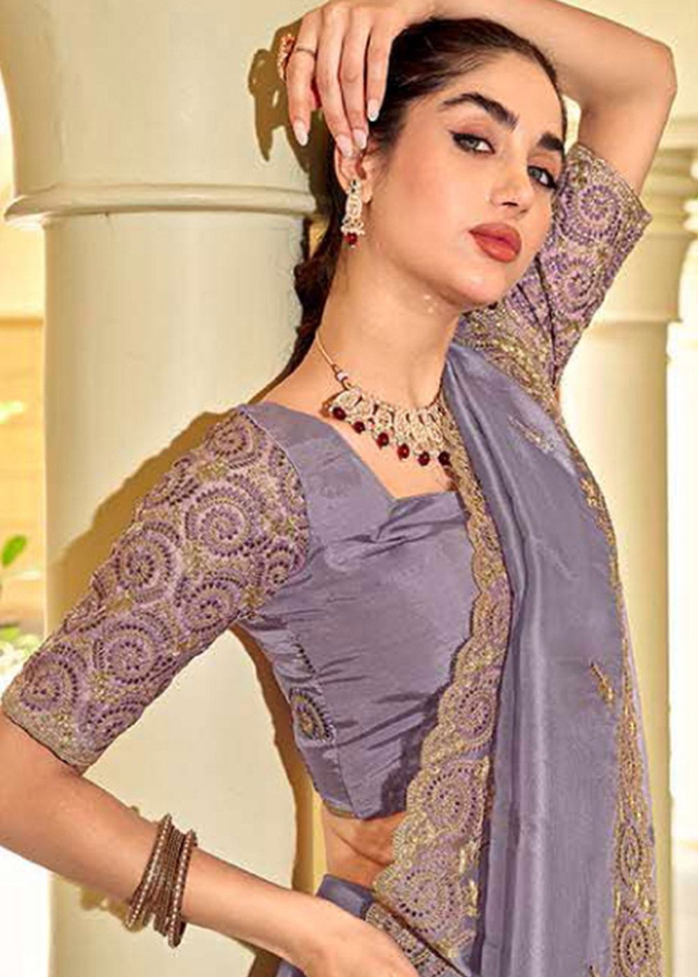 Display your beauty by adorning this purple-coloured silk saree enhanced by the embroidered border. Paired with a matching coloured embroidered silk blouse. The unstitched blouse can be customized upto 42 inches. Do Note: All the accessories shown are for styling purposes only. Slight colour variation may occur due to photographic reasons.