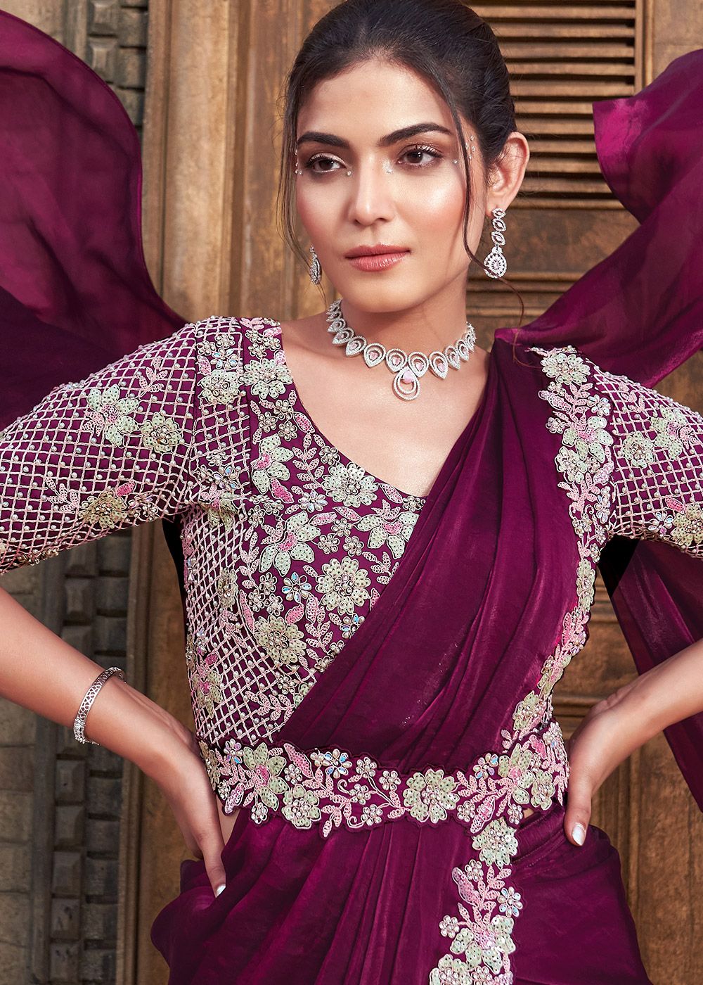 Steal the scene adorning this pre-stitched purple colored satin saree crafted with handwork embroidery enhanced by pre-draped pallu and embroidered belt. Paired with a matching colored satin embellished blouse. The stitched blouse can be customized up to 38 inches. Do Note: All the accessories shown are for stylingpurposes only. Slight color variation may occur due to photographic reasons.