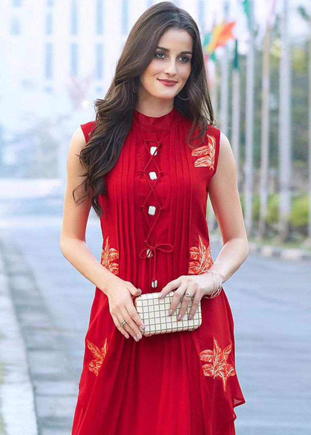 Red colored dress in georgette has been enhanced by pin tucks detailings along with tasseled dori knot tie up styled front. The sleeveless readymade dress has been beautified with resham thread work embroidered floral designs. The maximum length provided to the dress is 48 inches. Do Note: All accessories shown are for styling purpose only. Slight color variation may occur due to photographic reasons.