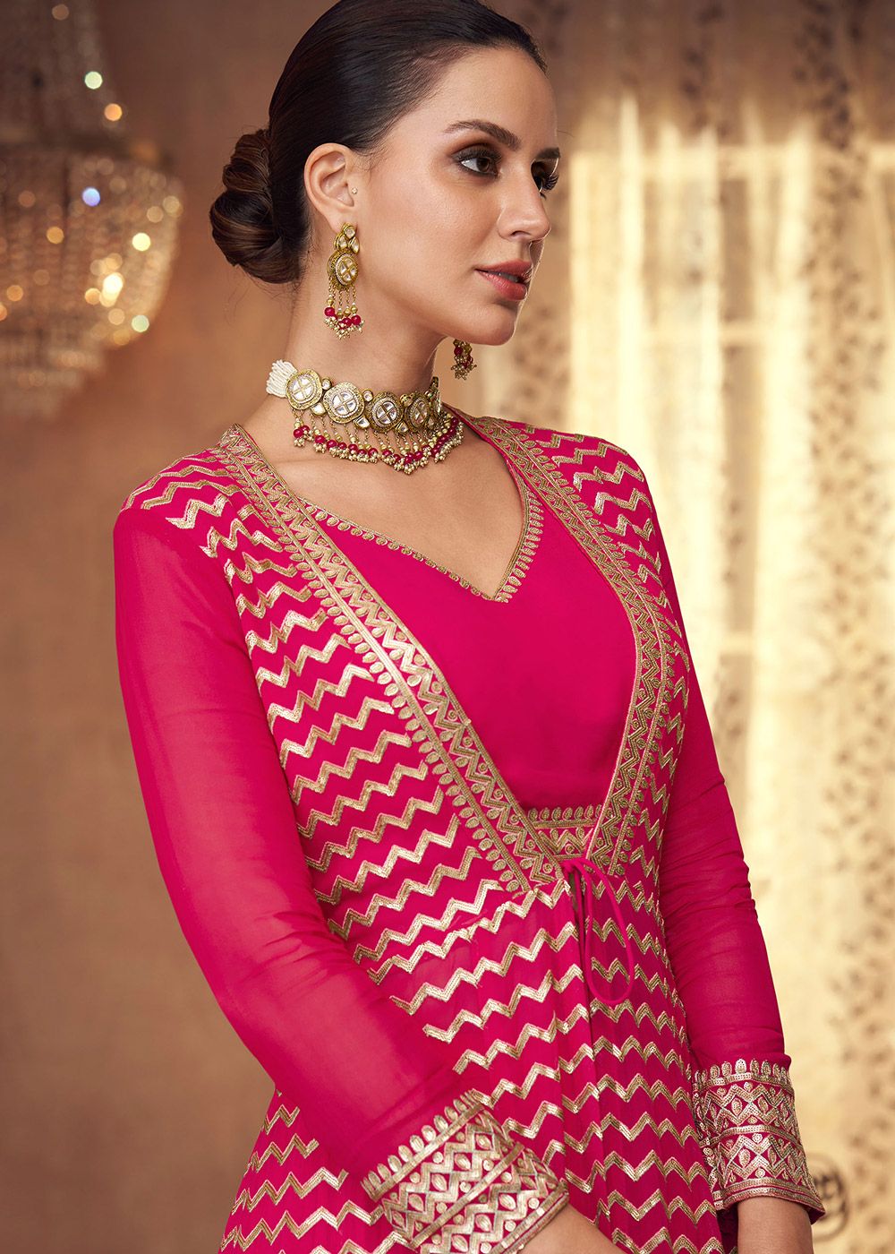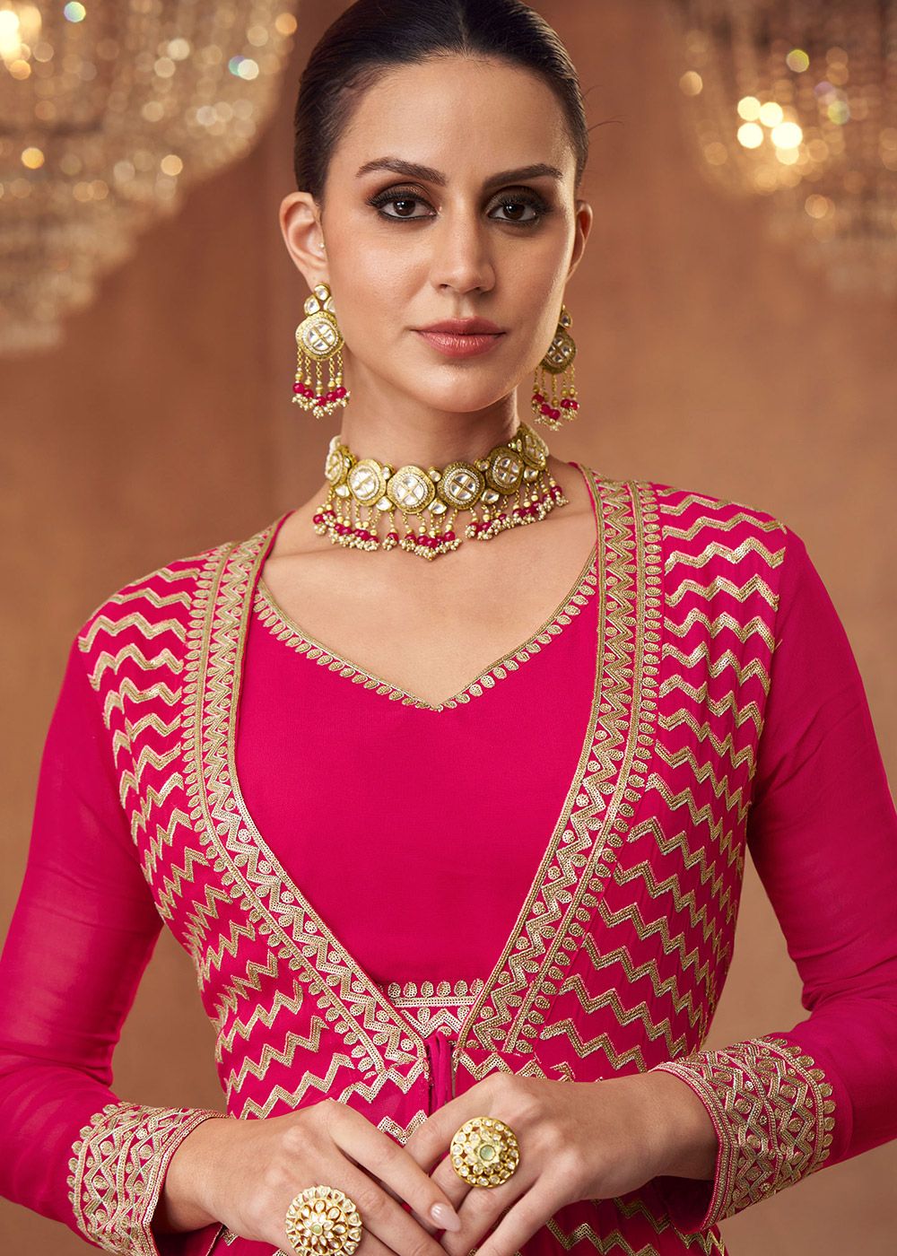 Make a ravishing statement adorning this readymade pink colored georgette lehenga crafted with sequins, thread embroidery. Paired with matching colored georgette choli, jacket and a georgette dupatta, all embellished in similar embroidery. The given length of the lehenga is 54 inches. Do note: All the accessories shown are for styling purposes only. Slight color variation may occur due to photographic reasons.