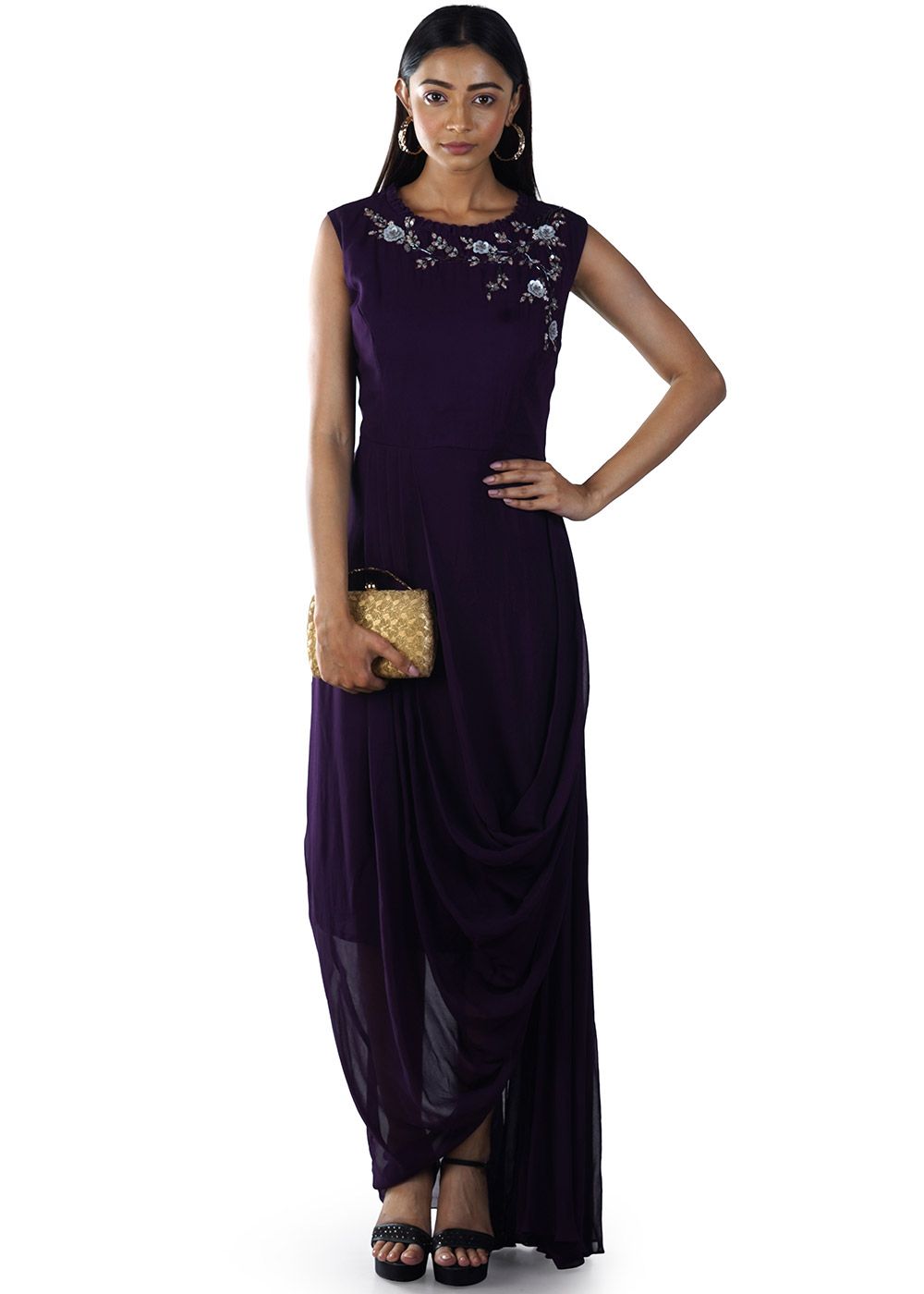 Showcasing a readymade purple color floral embroidered draped gown in georgette and organza silk. The gown is embellished with hand work embroidery in cutbeads and sequins work around the neckline with a draped & pleated lower pattern. The maximum length of the gown is 58 inches. Do Note: All Accessories shown are for styling purpose only. Slight color variation may occur due to photographic reasons.