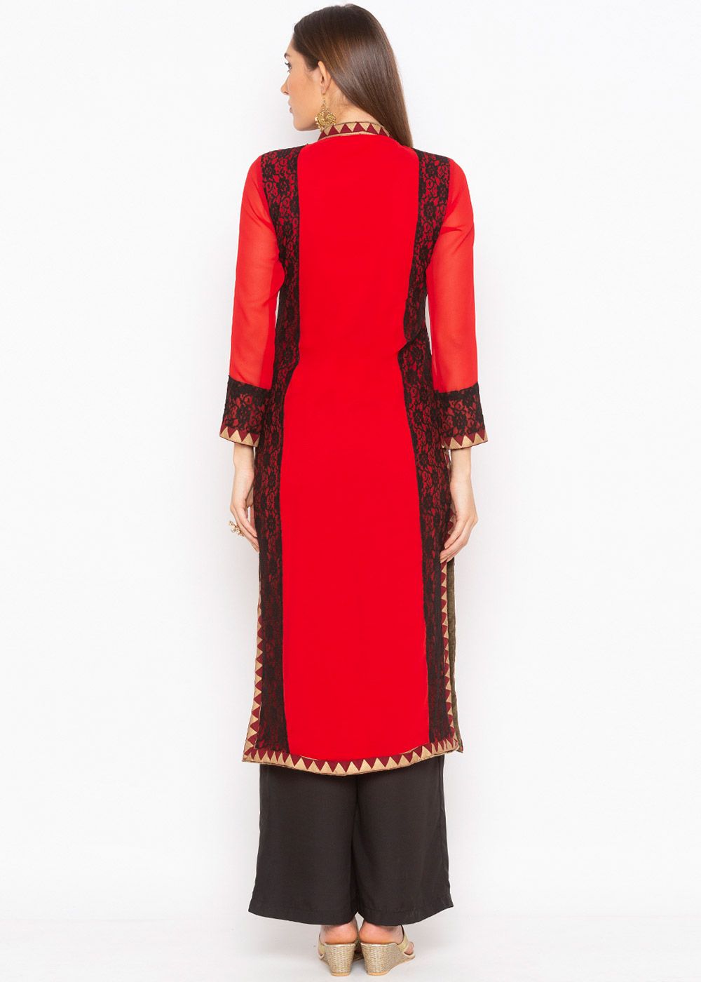 Get your hands on this readymade straight cut red color georgette kurti enhanced with thread embroidered motif and woven details. The kurti features mandarin neck and 3/4th sleeves. Provided with crape lining under it and the maximum length given to the kurta is 46 inches. Do Note: All Accessories shown are for styling purpose only. Slight color variation may occur due to photographic reasons.