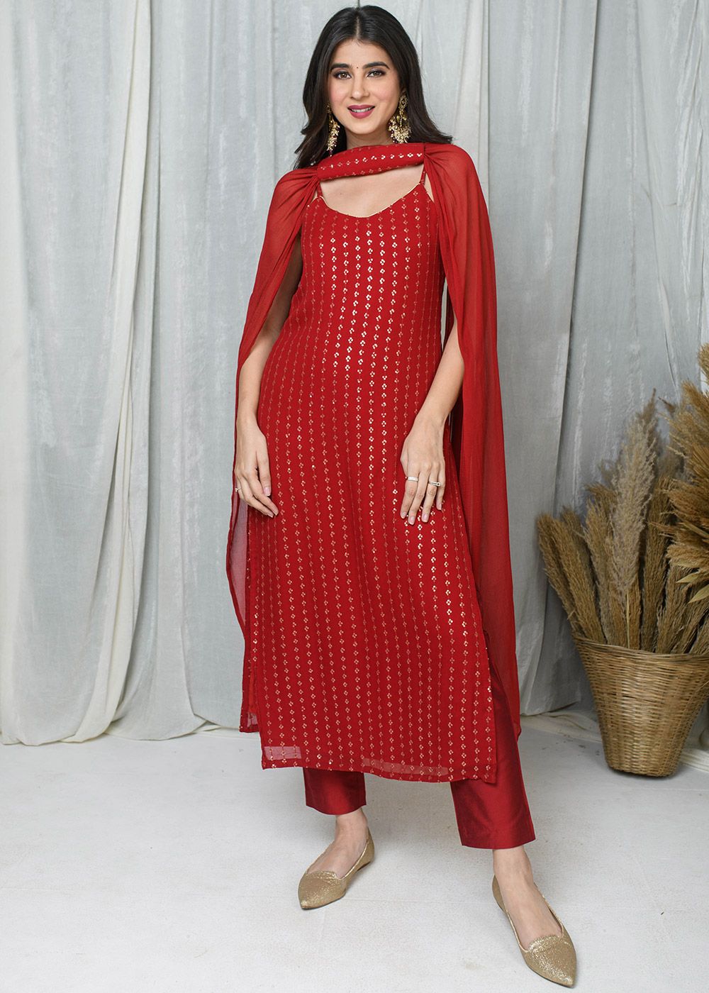 Grace the ambiance adorning this readymade red colored georgette kameez crafted with sequins embroidery. Paired with a matching colored silk pant and a chiffon dupatta. Do Note: All the accessories shown are for styling purposes only. Slight color variation may occur due to photographic reasons.