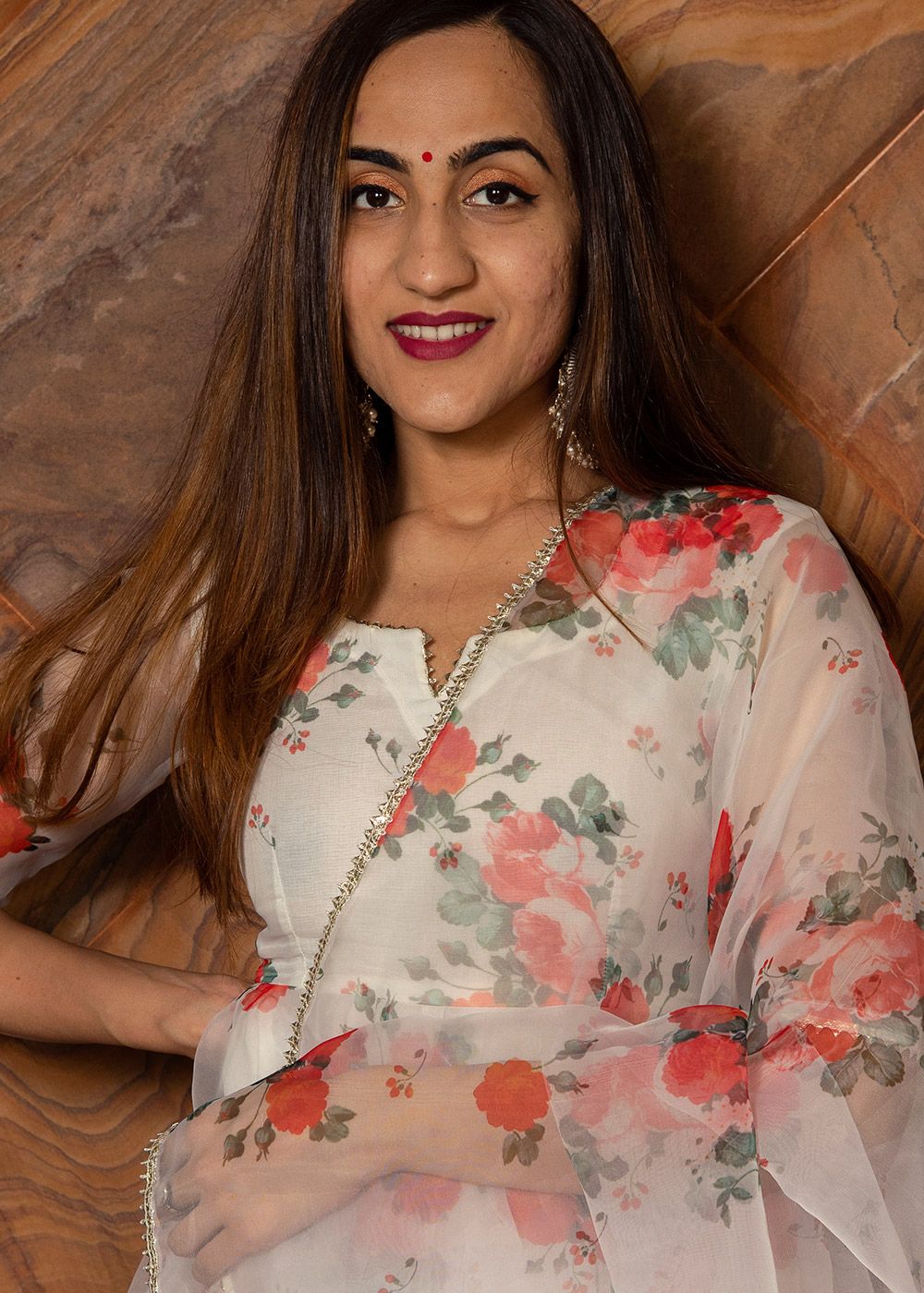 Display your beauty adorning this readymade white colored organza kameez crafted with floral printed motifs all over enhanced by gota lace work detail. The kameez also features anarkali style, elbow sleeves, and round neckline. Comes along with a matching colored cotton pant and a white colored organza dupatta in similar print. Do Note: All the accessories shown are for styling purposes only. Slight color variation may occur due to photographic reasons.