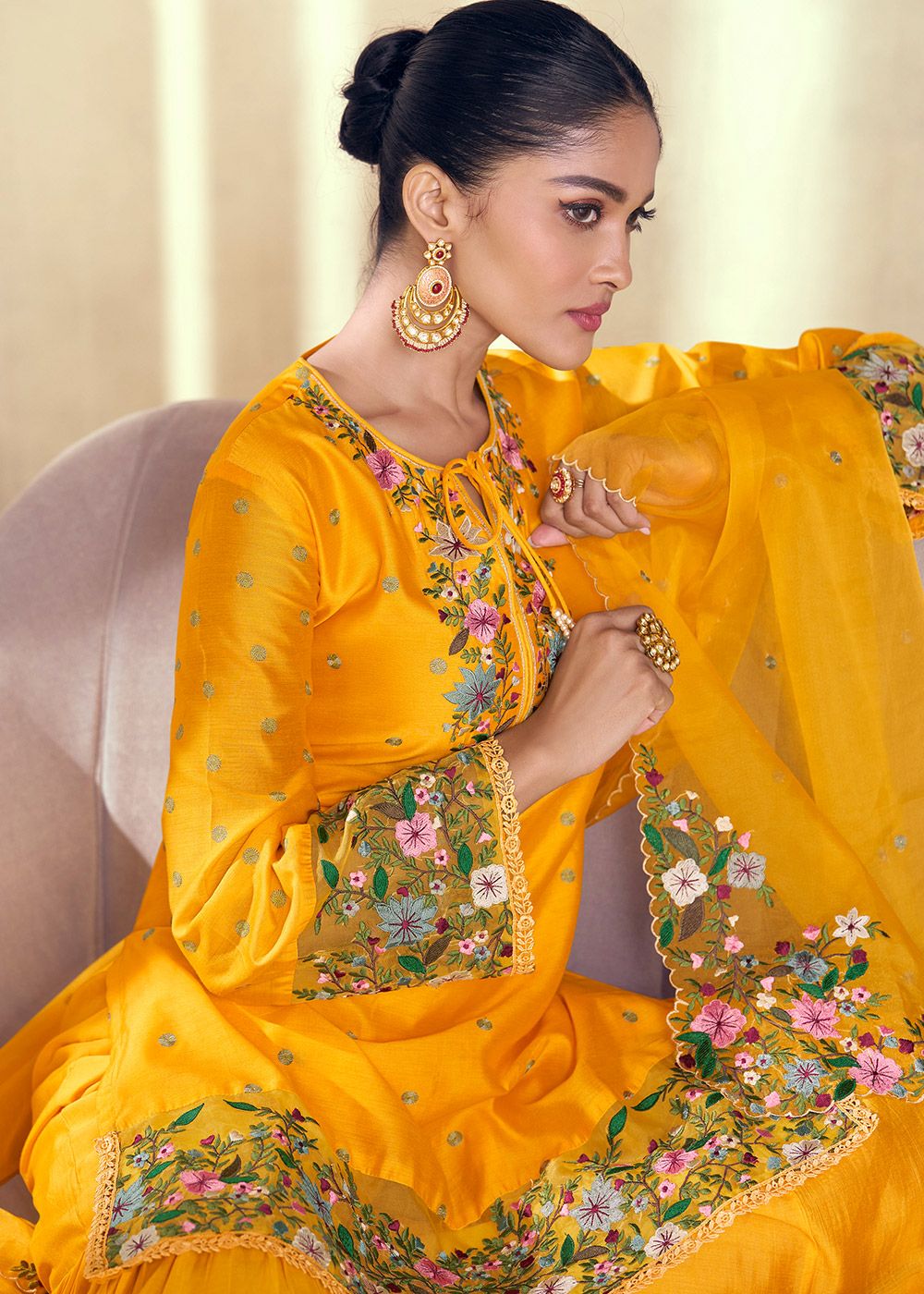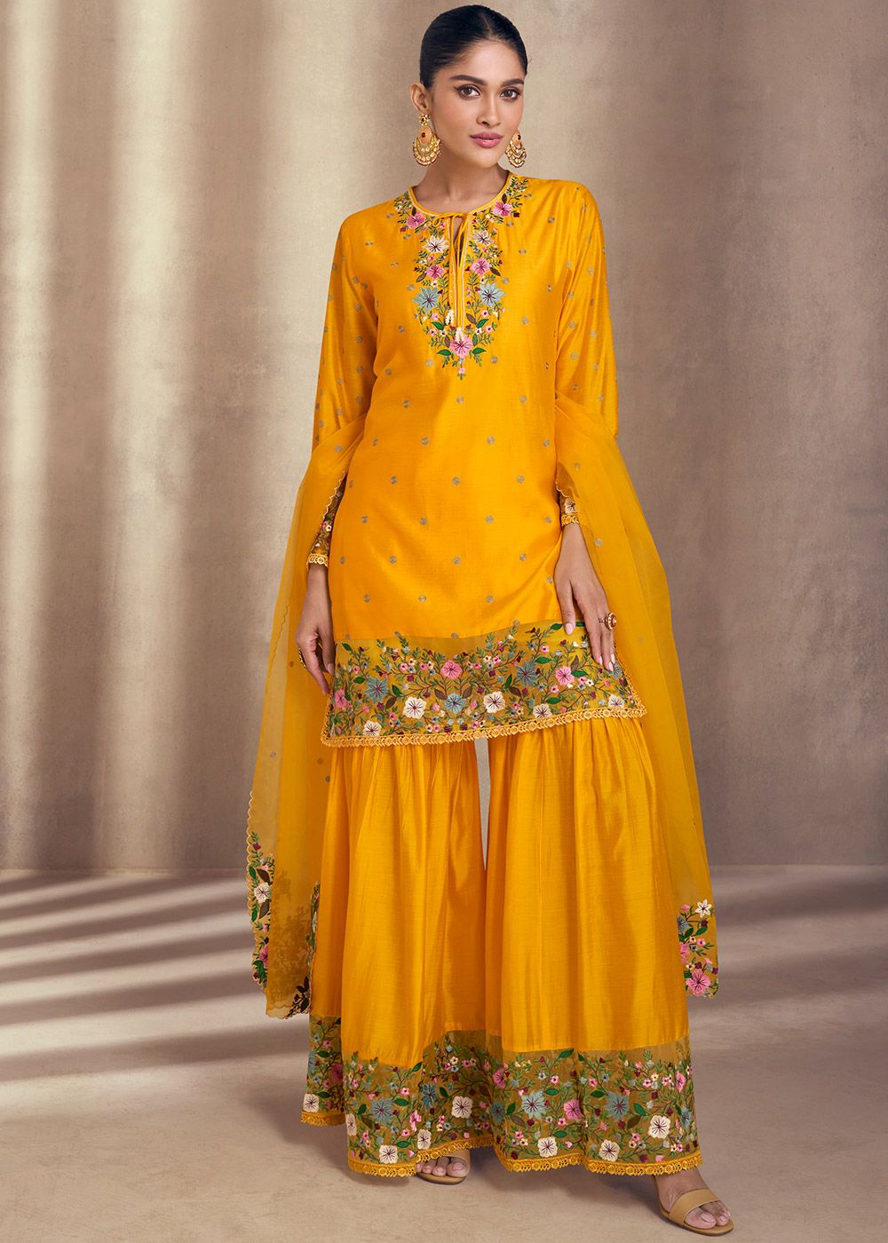 Readymade Yellow Embroidered Gharara Suit In Silk