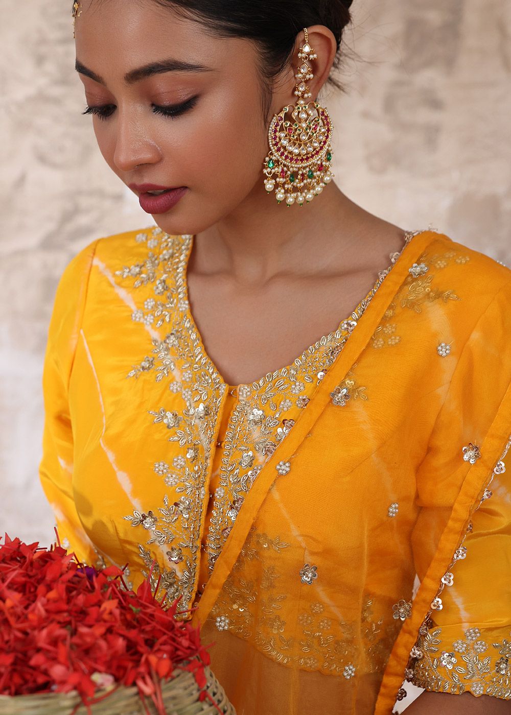 Steal the limelight adorning this readymade amber yellow colored silk lehenga crafted with leheria print all over enhanced by zari and sequins embroidered border. Paired along with a matching colored leheria printed silk choli and an amber yellow colored organza dupatta, both in similar work embroidery. Do Note: All the accessories shown are for styling purposes only. Slight color variation may occur due to photographic reasons.
