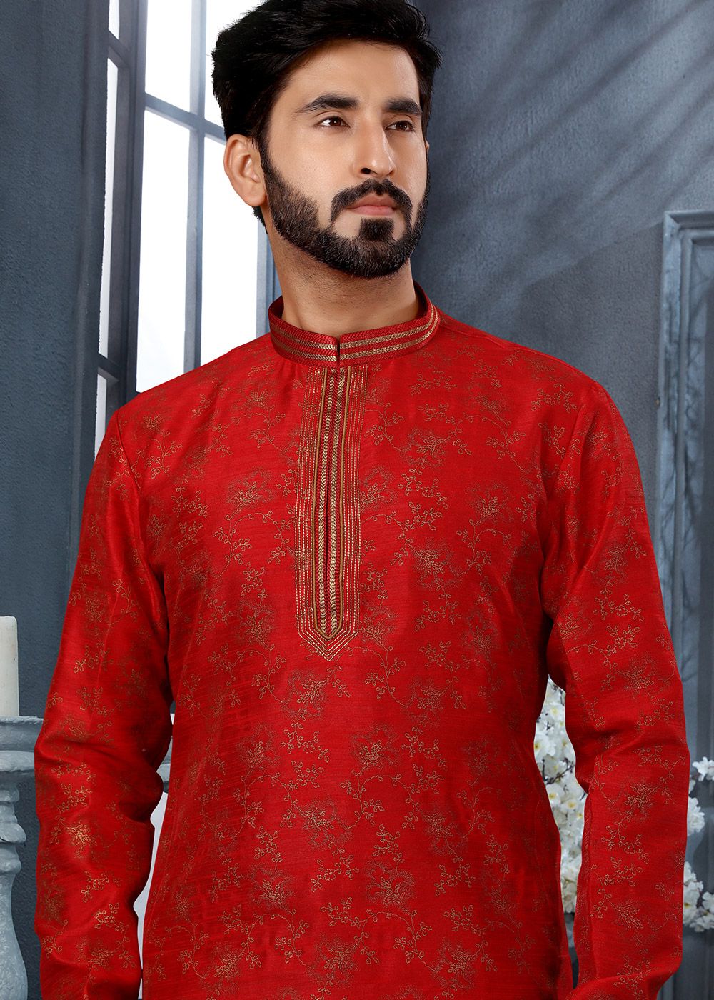 Red Woven Men Kurta Pajama In SilkSpecial Price US$55.50 Regular Price US$74.00 -
