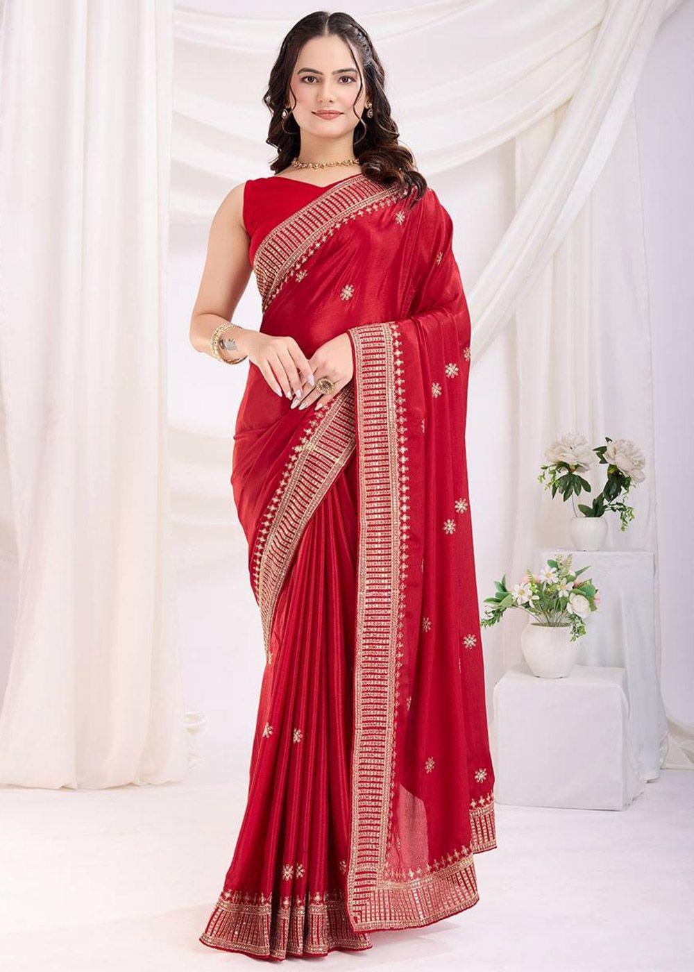 Red Stone Embellished Saree In SatinSpecial Price US$88.80 Regular Price US$111.00 -