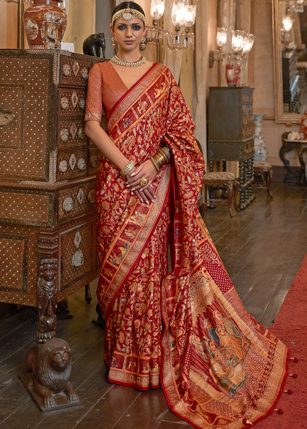 Make a statement adorning this red colored patola saree crafted with floral print work all over enhanced by stone work. Paired with a matching colored printed patola silk blouse. The unstitched blouse can be customized up to 42 inches. Do Note: All the accessories shown are for styling purposes only. Slight color variationmay occur due to photographic reasons.