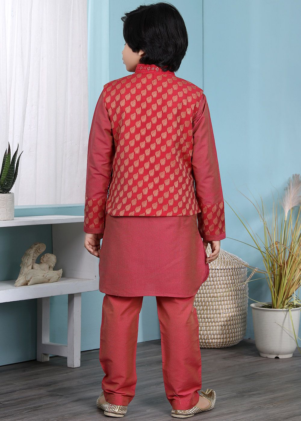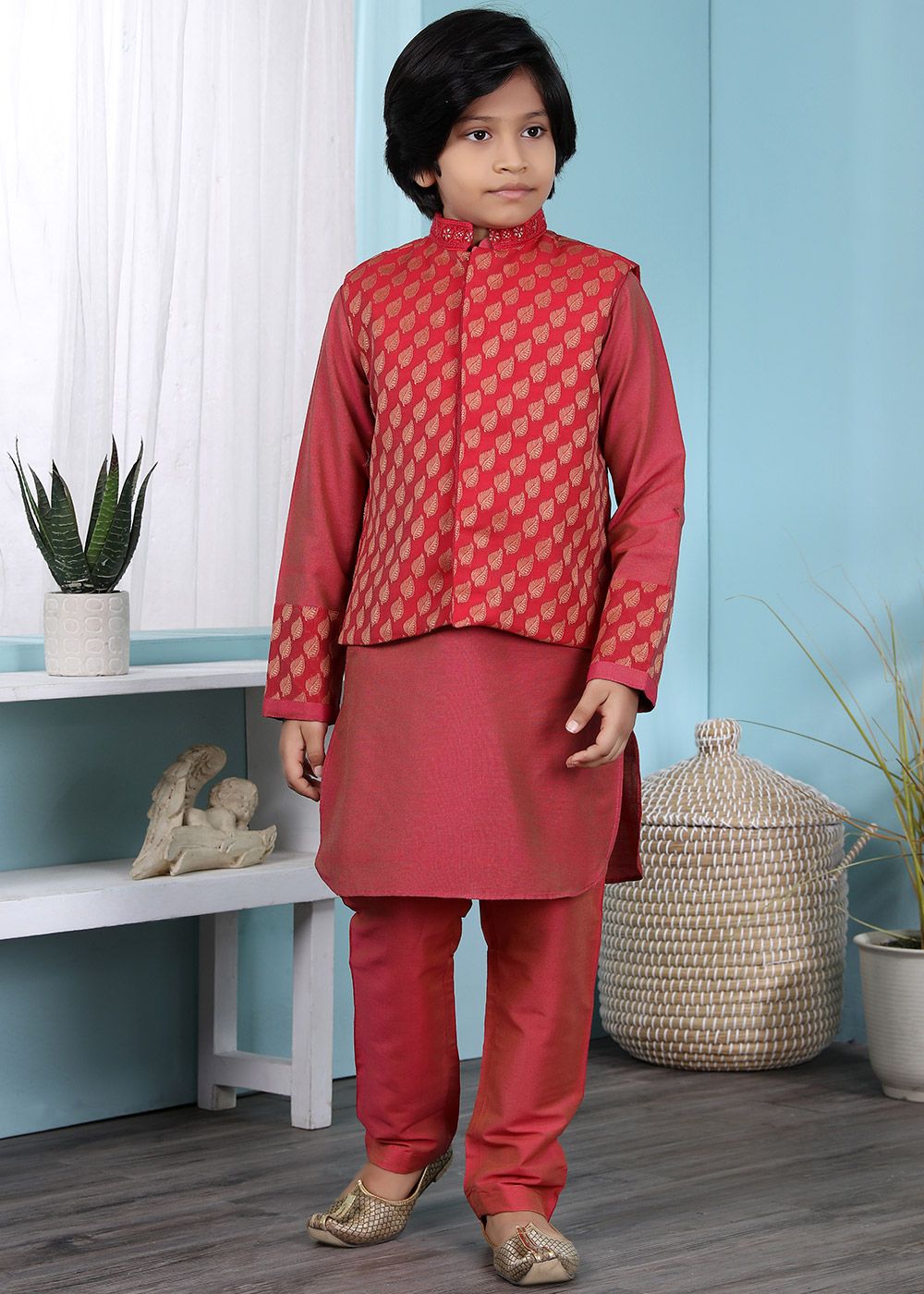 Feel festive adorning this blush red color kids readymade kurta in cotton silk crafted with full length sleeves. Available with matching red cotton silk pajama and a fire red color woven nehru jacket in chanderi silk with mandarin collar. Do Note: All Accessories shown are for styling purpose only. Buttons are a part of adornment and it can vary in design. Slight color variation may occur due to photographic reasons. Measurement variation up to 1 inch is possible.