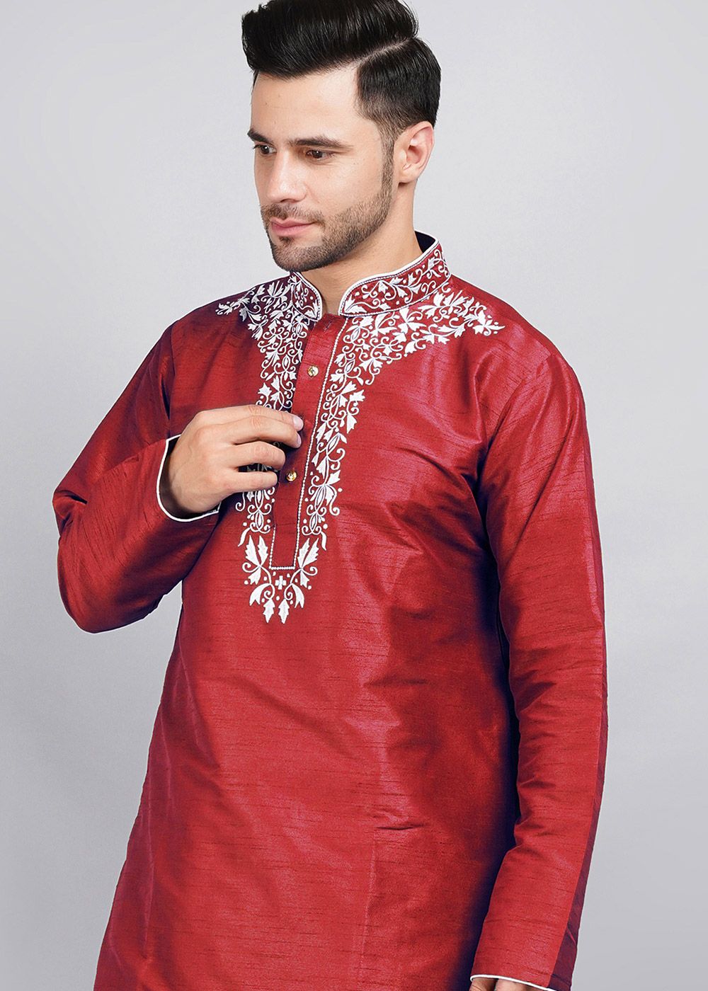 Red Mens Embroidered Kurta & Pajama Set