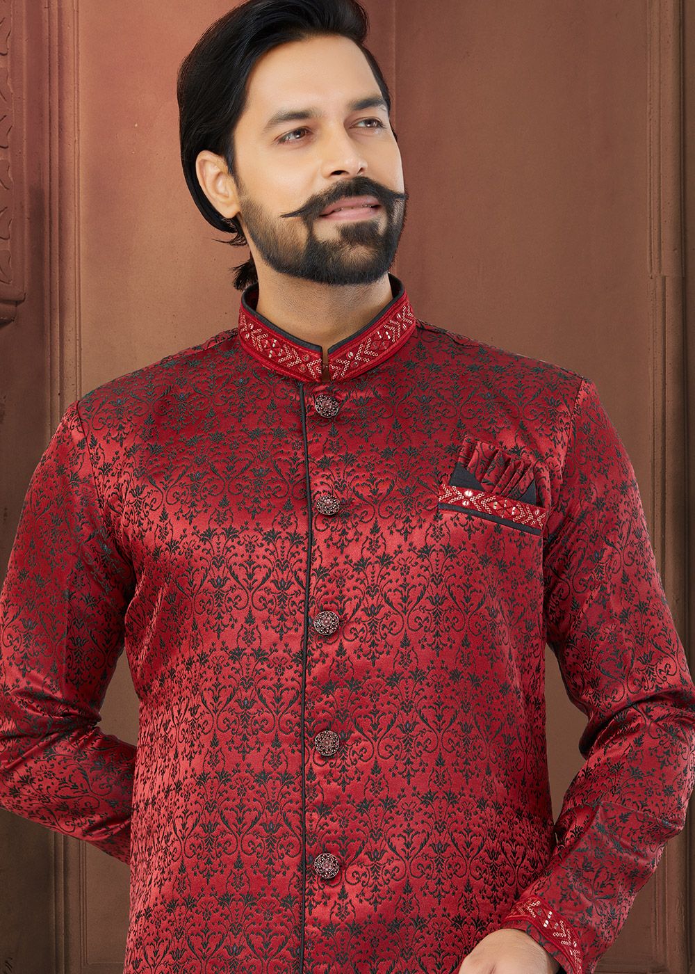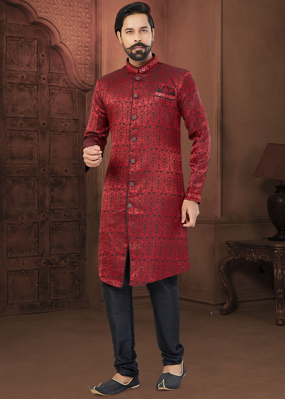 Red Woven Men Indo Western Sherwani SetSpecial Price US$95.25 Regular Price US$127.00 -