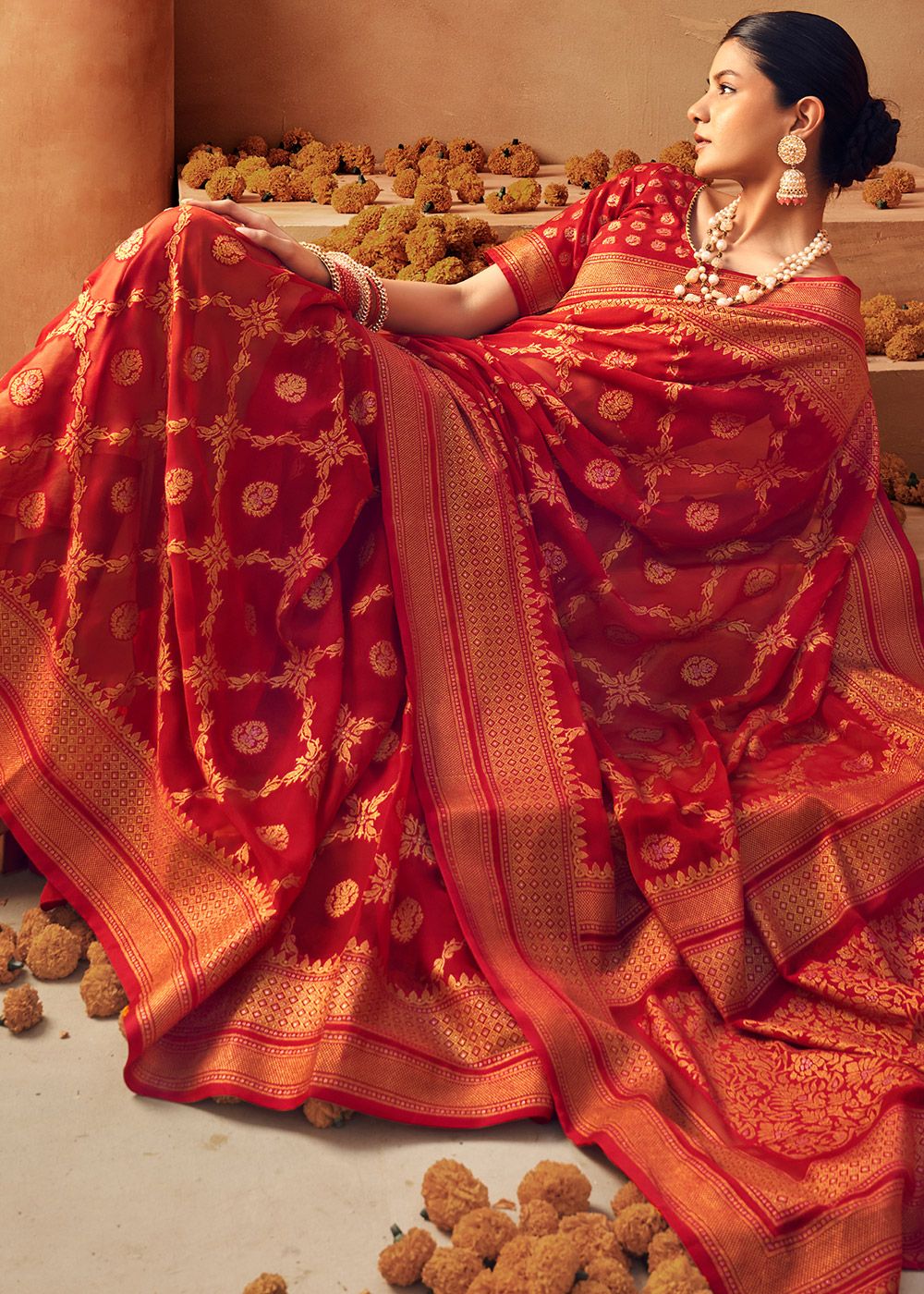 Grace the ambiance adorning this red colored georgette saree crafted with zari woven work all over. Paired with a matching colored georgette woven blouse. The unstitched blouse can be customized upto 42 inches. Do note: All the accessories shown are for styling purposes only. Slight color variation may occur due to photographic reasons.