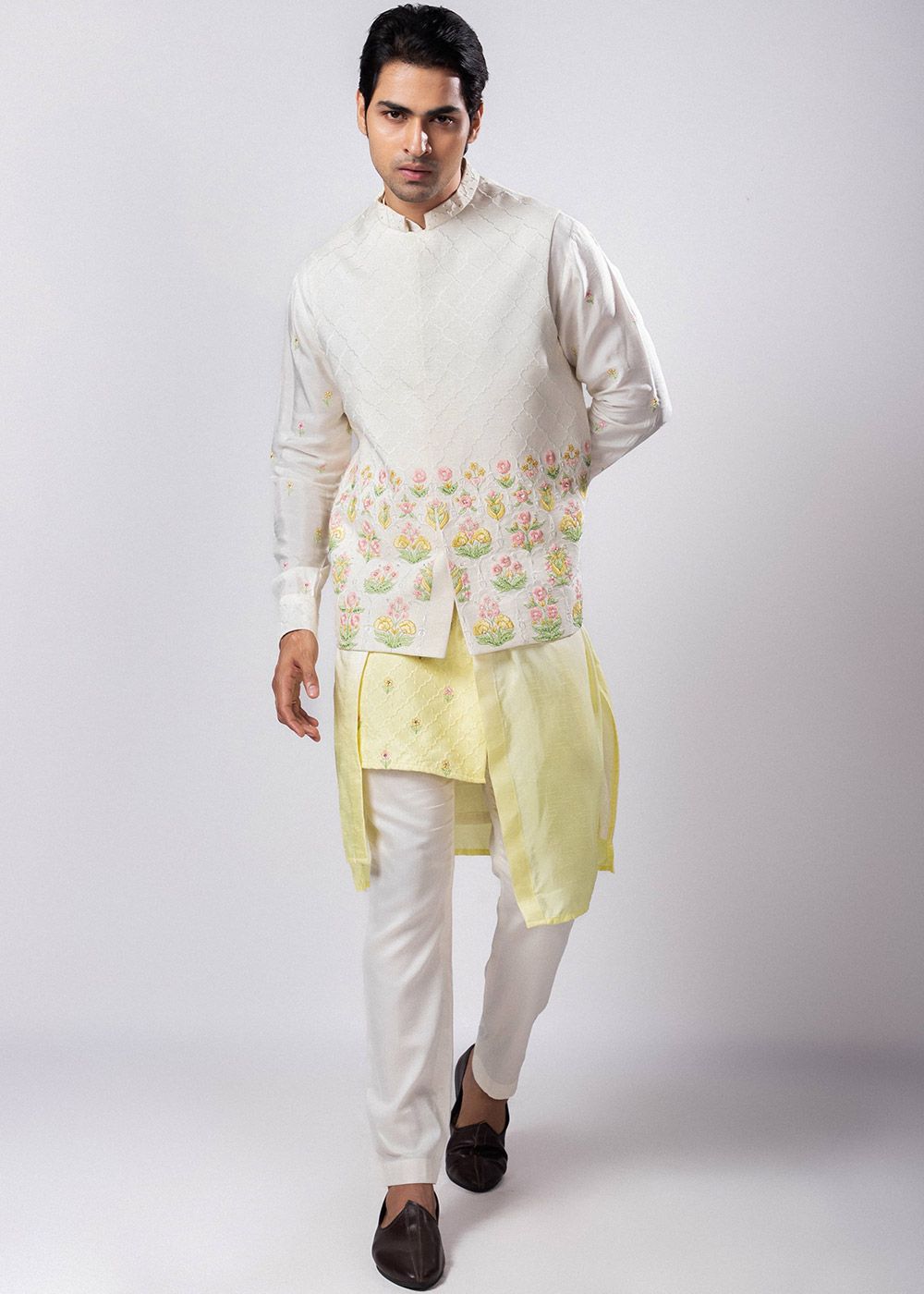 Shaded Cream & Yellow Nehru Jacket With Kurta Pajama