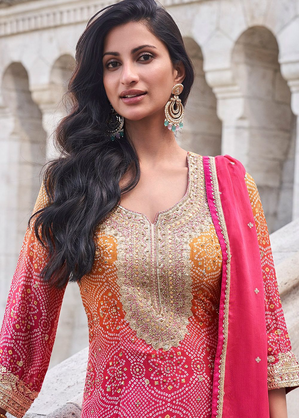 Make a statement adorning this readymade shaded pink colored chiffon kameez crafted with zari, sequins embroidery and bandhej print. Paired with a matching colored chiffon sharara and a laced chiffon dupatta. Do note: All the accessories shown are for styling purposes only. Slight color variation may occur due to photographic reasons.